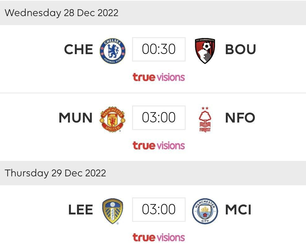 ការប្រកួតលីគកំពូលអង់គ្លេស English Premier League ក្នុងថ្ងៃ Boxing Day បានបញ្ចប់៧គូ ដោយមានការទាត់បញ្ចូលទីគ្នាទៅវិញទៅមករហូតដល់២៥គ្រាប់ គិតត្រឹមសប្តាហ៍ទី១៦ នាយប់ថ្ងៃចន្ទ ទី២៦ ឆ្នាំ២០២២។