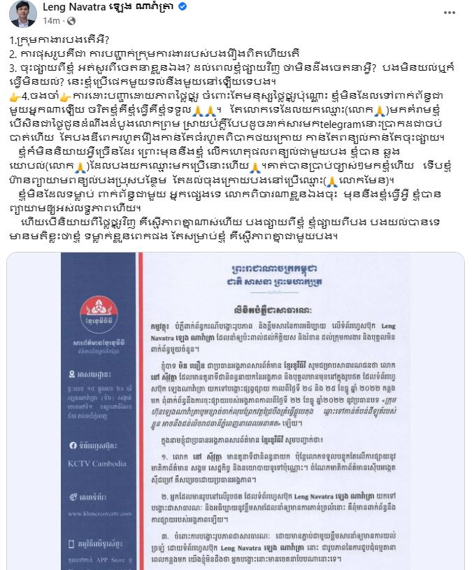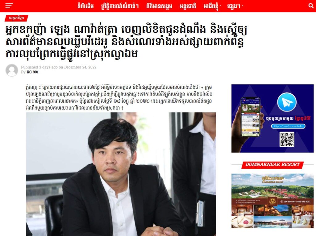 ភ្នំពេញ៖ អ្នកតាមដានព្រឹត្តិការណ៍សង្គមនៅលើបណ្ដាញសង្គមហ្វេសប៊ុកប្រហែលជាបានជ្រាបខ្លះៗហើយថាមួយរយៈនេះក្រុមហ៊ុន ឡេង ណាវ៉ាត្រា បានប៉ះទង្គិចគ្នាជាមួយនឹងសារព័ត៌មានខ្មែរខូវឺធីវីពាក់ព័ន្ធនឹងករណីលុបព្រែកវត្តជ្រៃបឹងគ្រំ ដោយភាគីក្រុមហ៊ុន ហ្គាឡាក់ស៉ី ណាវ៉ាត់ត្រា គ្រុប ឯ.ក របស់អ្នកឧកញ៉ាច្រានចោលការចោទប្រកាន់ការចុះផ្សាយរបស់សារព័ត៌មាននេះ។ ដោយឡែកភាគីសារព័ត៌មានខូវឺធីវីទើបតែចេញលិខិតបំភ្លឺ៥ចំណុច ឆ្លើយតបចំពោះការលើកឡើងរបស់ផេកផ្លូវការរបស់អ្នកឧកញ៉ា ឡេង ណាវ៉ាត្រា។