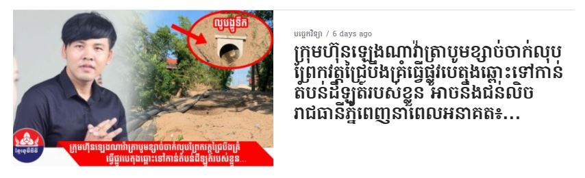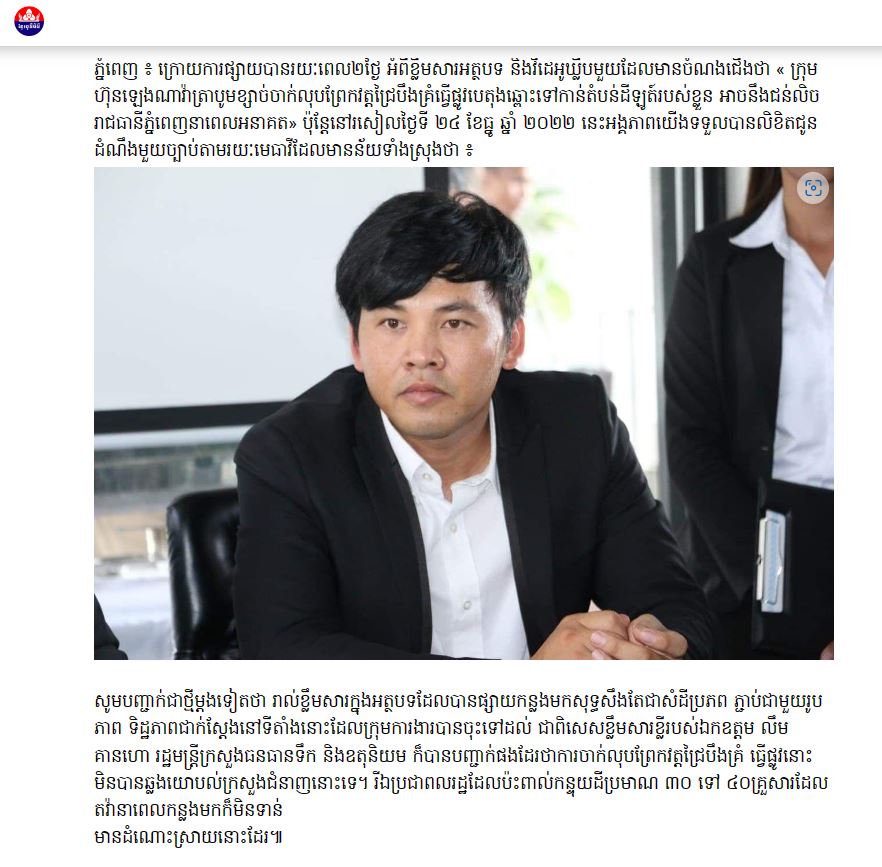 អានអត្ថបទដើម ៖ ក្រុមហ៊ុនឡេងណាវ៉ាត្រាបូមខ្សាច់ចាក់លុបព្រែកវត្តជ្រៃបឹងគ្រំធ្វើផ្លូវបេតុងឆ្ពោះទៅកាន់តំបន់ដីឡូត៍របស់ខ្លួន អាចនឹងជន់លិចរាជធានីភ្នំពេញនាពេលអនាគត៖…