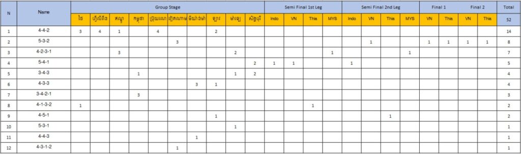 ខណ:ទម្រង់លេង 4-4-2 ត្រូវបានគេប្រើច្រើនជាងគេរហូតដល់១៤លើក គិតទាំង២៦ប្រកួតទាំងអស់ នេះបើយោងតាមការបញ្ជាក់របស់គេហទំព័រ AFF Mitsubishi Electric Cup មានដូចជា៖ ថៃ ៣លើក, ហ្វីលីពីន ៤លើក, ប្រ៊ុយណេ ៤លើក ឡាវ ២លើក និងឥណ្ឌូណេស៊ី ១លើក។