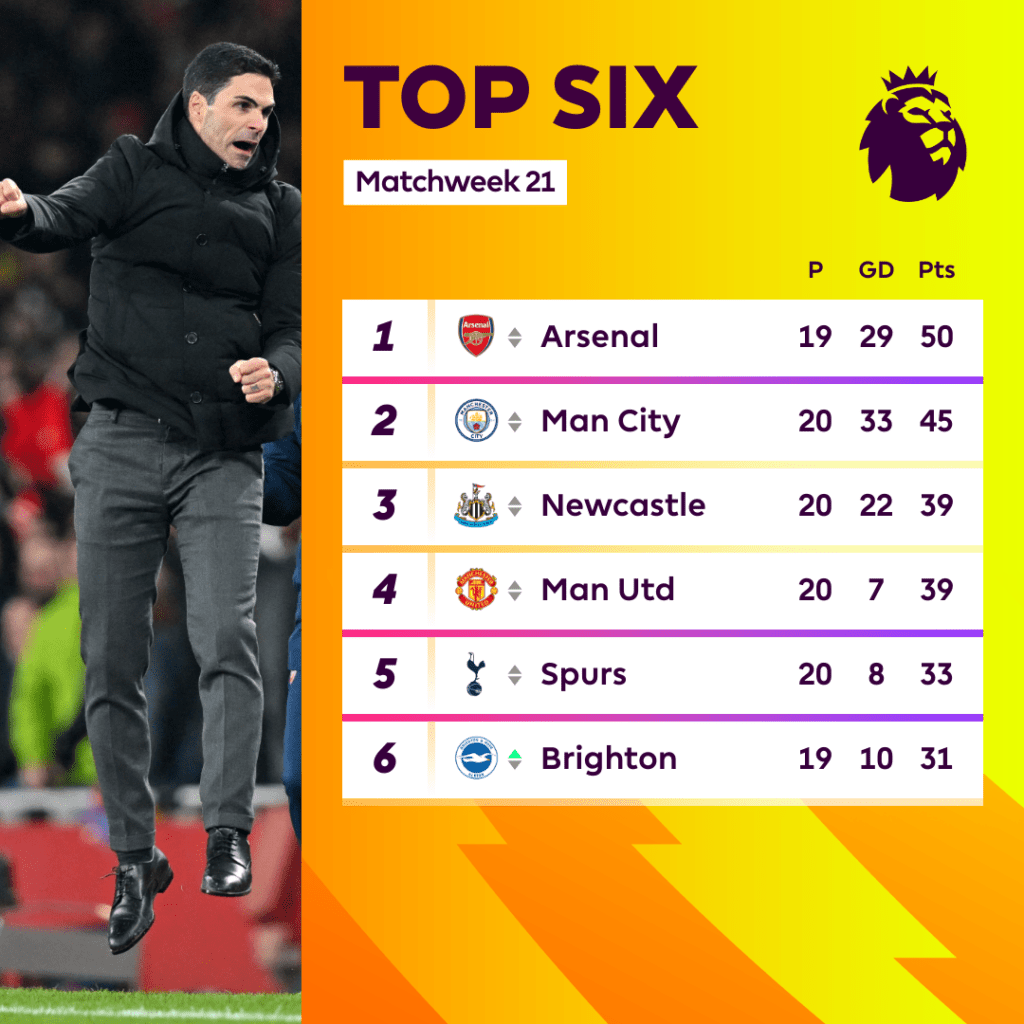 បច្ចុប្បន្ន Arsenal បន្តឈរកំពូលតារាង Premier League ក្រោយឆ្លងកាត់ ១៩ប្រកួត ឈ្នះ១៦ ស្មើ២ និងចាញ់១ មាន៥០ពិន្ទុ ខណ: Man City ឈរលេខ២ មាន៤៥ពិន្ទុប៉ុណ្ណោះ ជាមួយ២០ប្រកួតក្នុងដៃ លើស Arsenal ១ប្រកួត៕