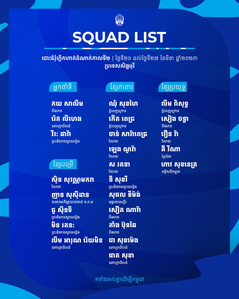 ខណ:កាលពីរសៀលថ្ងៃសុក្រ ទី១៧ ខែមីនា ឆ្នាំ២០២៣ សហព័ន្ធកីឡាបាល់ទាត់កម្ពុជា បានបញ្ចេញបញ្ជីឈ្មោះកីឡាករ ជម្រើសជាតិកម្ពុជា អាយុក្រោម២២ឆ្នាំ សរុប២៤នាក់ ក្នុងនោះកីឡាករចំនួន៦នាក់ដែលមានដូចជា៖ សារ ទី (បញ្ហារបួស), ទេព ហ្វីលីព, វុំាង ដាវីន, អ៊ីម វ៉ាឃីម, រី លាភផេង និង អ៊ាន ពិសី ត្រូវបានដកចេញពីបញ្ជីឈ្មោះសម្រាប់ការបោះជំរុំហ្វឹកហាត់ដំណាក់កាលទី២ មុនស៊ីហ្គេម។