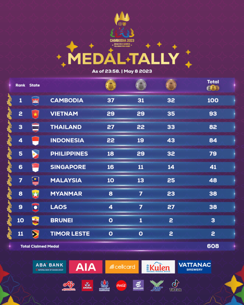តារាងបច្ចុប្បន្នភាពមេដាយ នៃព្រឹត្តិការណ៍ស៊ីហ្គេមលើកទី៣២ ឆ្នាំ២០២៣ នៅ ព្រះរាជាណា ចក្រ កម្ពុជា។ គិតត្រឹមយប់ ថ្ងៃទ០៨ ឧសភា ឆ្នាំ២០២៣នេះ កម្ពុជា យើងទទួលបាន មេដាយ មាសសរុប៣៧មេដាយមាសរួចហើយ ដែលកំពុងឈរនៅក្នុងចំណាត់ថ្នាក់លេខរៀងទី១៕
