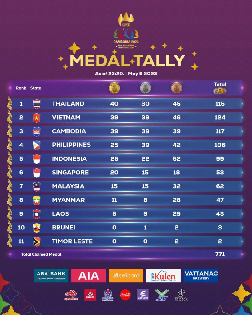 តារាងបច្ចុប្បន្នភាពមេដាយ នៃព្រឹត្តិការណ៍ស៊ីហ្គេមលើកទី៣២ ឆ្នាំ២០២៣ នៅ ព្រះរាជាណា ចក្រ កម្ពុជា។ គិតត្រឹមយប់ ថ្ងៃទ០៩ ឧសភា ឆ្នាំ២០២៣នេះ កម្ពុជា យើងទទួលបាន មេដាយ មាសសរុប ៣៩មេដាយមាសរួចហើយ ដែលកំពុងឈរនៅក្នុងចំណាត់ថ្នាក់លេខរៀងទី៣៕