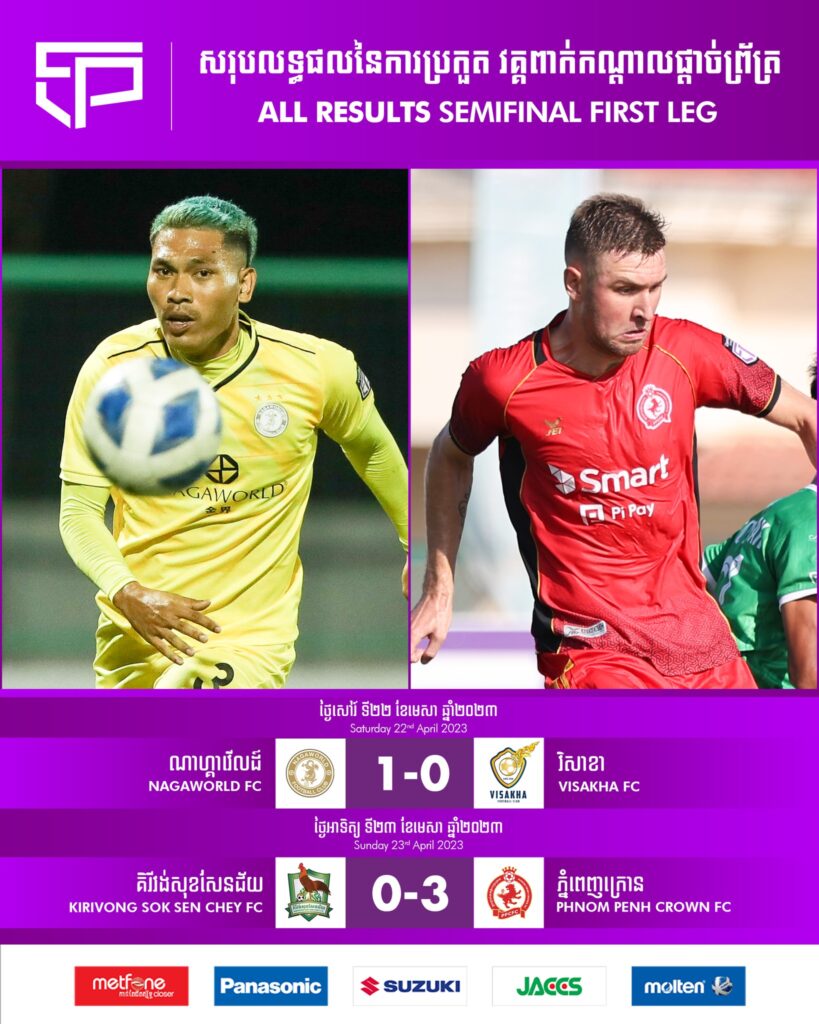ការប្រកួតវគ្គពាក់កណ្តាលផ្តាច់ព្រ័ត្រ ជើងទី២ នឹងត្រូវធ្វើឡើងនៅថ្ងៃទី២៧ មេសា ២០២៣ វិសាខា ប៉ះ ណាហ្គាវើលដ៍ នៅកីឡដ្ឋានព្រីនស៍។ ខណ:ថ្ងៃទី២៨ មេសា ២០២៣ ភ្នំពេញក្រោន ប៉ះ គិរីវង់សុខសែនជ័យ នៅកីឡដ្ឋាន Smart RSN៕