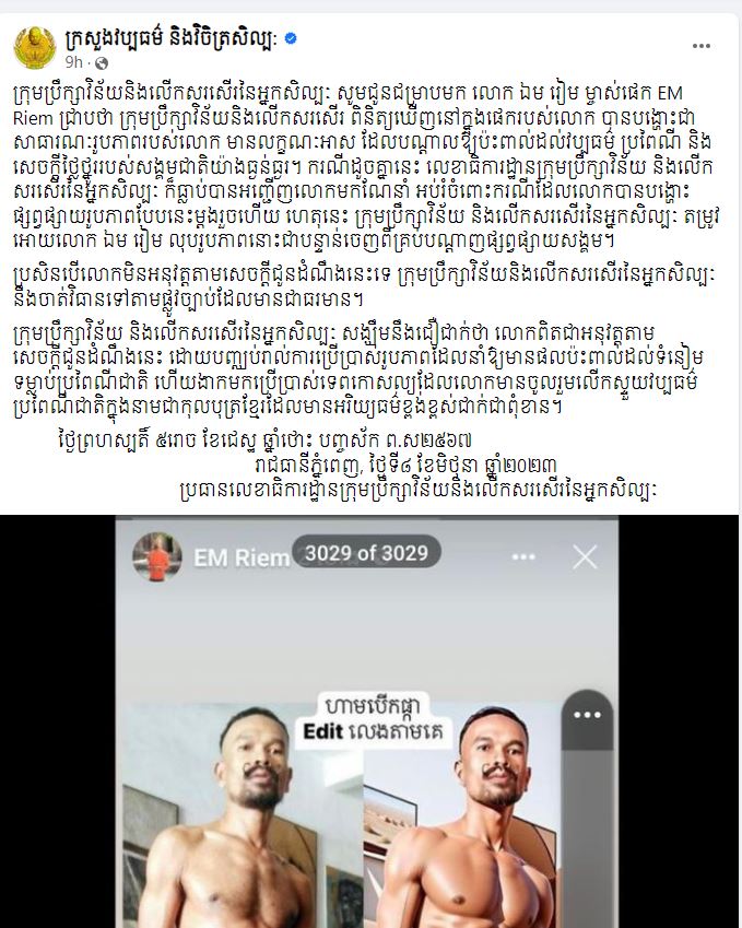 សិល្បៈជាតិ៖ តាមក្រសួងវប្បធម៌ និងវិចិត្រសិល្បៈ បានឱ្យដឹងថា ក្រុមប្រឹក្សាវិន័យនិងលើកសរសើរនៃអ្នកសិល្បៈ សូមជូនជម្រាបមក លោក ឯម រៀម ម្ចាស់ផេក EM Riem ជ្រាបថា ក្រុមប្រឹក្សាវិន័យនិងលើកសរសើរ ពិនិត្យឃើញនៅក្នុងផេករបស់លោក បានបង្ហោះជាសាធារណៈរូបភាពរបស់លោក មានលក្ខណៈអាសដែលបណ្តាលឱ្យប៉ះពាល់ដល់វប្បធម៌ ប្រពៃណី និង សេចក្តីថ្លៃថ្នូររបស់សង្គមជាតិយ៉ាងធ្ងន់ធ្ងរ។