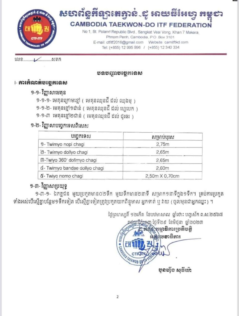 វិញ្ញាបច្ចេកទេសពិសេស និងមេគុន ពុំមានចំណាត់ថ្នាក់ លេខ ៣ស្ទួនទេ មានតែវិញ្ញាសាប្រយុទ្ធទេ មានលេខ៣ស្ទួន។ ការទទួលពាក្យប្រកួតចាប់ពីថ្ងៃជូនដំណឹងនេះរហូតដល់ ថ្ងៃទី៥ ខែកក្កដា ឆ្នាំ២០២៣ វេលាម៉ោង១៧:០០នាទី នៅសហព័ន្ធ៕