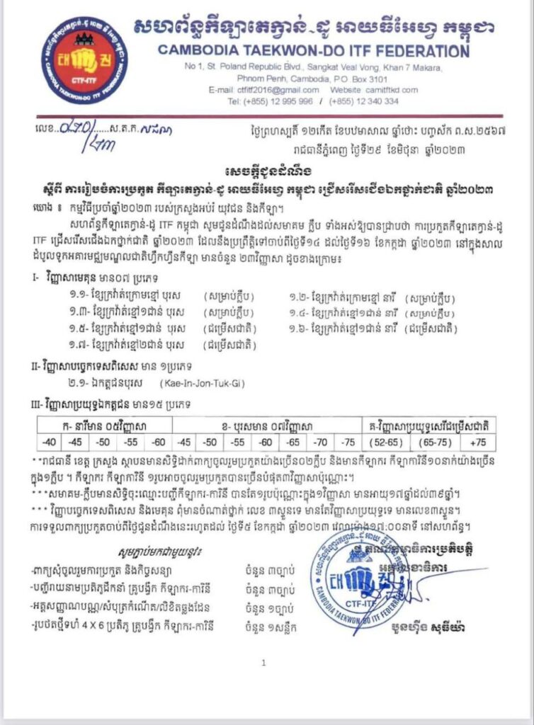 សហព័ន្ធកីឡាតេក្វាន់-ដូ ITF កម្ពុជា សូមជូនដំណឹងដល់សមាគម ក្លឹប ទាំងអស់ឱ្យបានជ្រាបថា ការប្រកួតកីឡាតេក្វាន់-ដូ ITF ជ្រើសរើសជើងឯកថ្នាក់ជាតិ ឆ្នាំ២០២៣ ដែលនឹងប្រព្រឹត្តិទៅចាប់ពីថ្ងៃទី១៤ ដល់ថ្ងៃទី១៦ ខែកក្កដា ឆ្នាំ២០២៣ នៅក្នុងសាល ដំបូលទូកអគារមជ្ឈមណ្ឌលជាតិហ្វឹកហ្វឺនកីឡា មានចំនួន ២៣វិញ្ញាសា ដូចខាងក្រោម៖