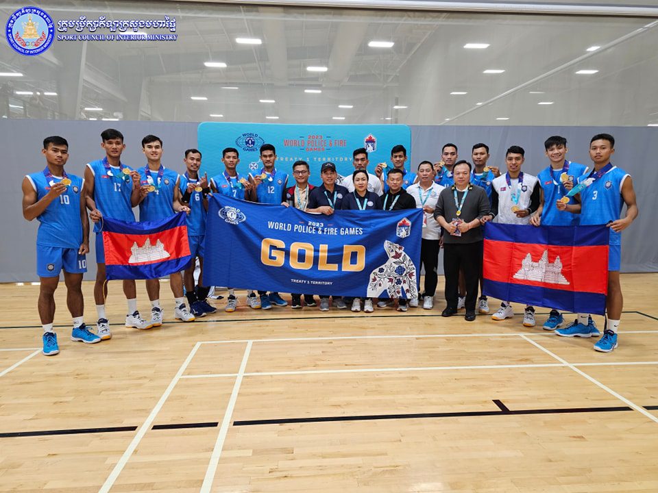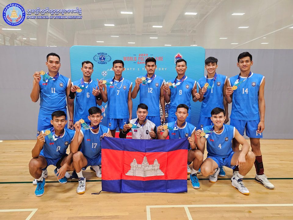 ក្រុមបាល់ទះក្រសួងមហាផ្ទៃ របស់កម្ពុជា ដណ្តើមបានមេដាយមាស ក្នុងព្រឹត្តិការណ៍ World Police & Fire Games 2023 នាទីក្រុង Winnipeg ប្រទេសកាណាដា ក្រោយយកឈ្នះក្រុមបាល់ទះប្រេស៊ីល CBMDF ក្នុងលទ្ធផល ៣សិតទល់នឹង០ នៅវគ្គផ្តាច់ព្រ័ត្រ។