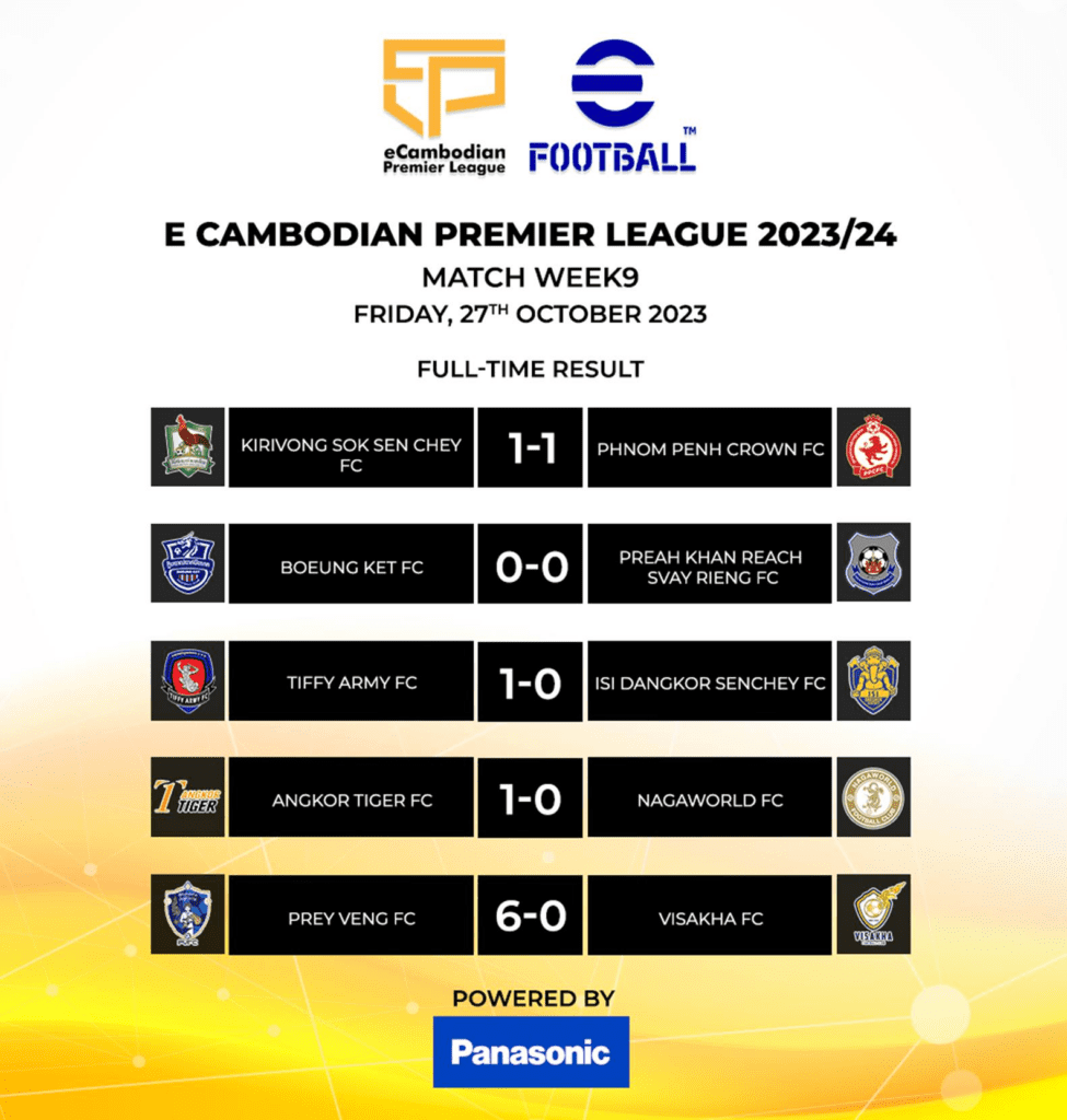 ការប្រកួតកីឡាអេឡិចត្រូនិច eCambodian Premier League រដូវកាលឆ្នាំ២០២៣-២៤ បានបញ្ចប់សប្តាហ៍ទី៩ ហើយកាលពីថ្ងៃទី២៧ ខែតុលា ឆ្នាំ២០២៣ កន្លងទៅក្នុងនោះឃើញថា ក្រុមព្រៃវែង ជាក្រុមមិនទាន់ចាញ់សោះ ខណៈទ័ព ទើបឈ្នះ ក្រោយចាញ់ ៣លើកជាប់ៗគ្នា។