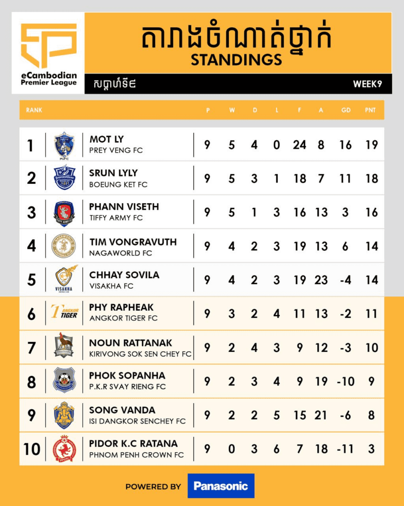 ខាងក្រោមនេះជាតារាងចំណាត់ថ្នាក់ត្រឹមសប្តាហ៍ទី៩