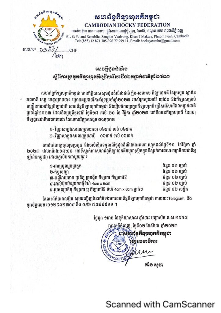 សហព័ន្ធកីឡាហុកគីកម្ពុជា បានជូនដំណឹងដល់ ក្លឹប-សមាគម កីឡាហុកគី នៃក្រសួងស្ថាប័នរាជធានី-ខេត្ត មេត្តាជ្រាបថា៖ ក្រោមគម្រងថវិកាគាំទ្រប្រចាំឆ្នាំ២០២៣ របស់ក្រសួងអប់រំ យុវជន និងកីឡាសម្រាប់ ពន្លឿនការអភិវឌ្ឍកីឡាជាតិ សហព័ន្ធកីឡាហុកគីកម្ពុជា នឹងរៀបចំការប្រកួតកីឡាហុកគី ជ្រើសរើសជើងឯកថ្នាក់ជាតិ ប្រចាំឆ្នាំ២០២៣។
