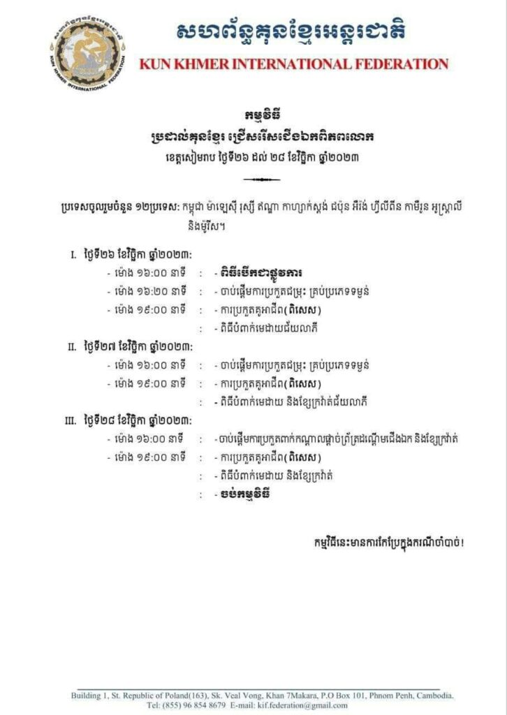 ព្រឹត្តិការណ៍ប្រកួតគុនខ្មែរជើងឯកពិភពលោក នៅតំបន់ឣង្គរ ខេត្តសៀមរាប ដែលនឹងចាប់ផ្ដើមប្រកួតចាប់ពីថ្ងៃទី២៦-២៧-២៨ ខែវិច្ឆិកា ឆ្នាំ២០២៣ ខាងមុខ ក្នុងនោះមានវត្តមានដូចជាកីឡាប្រដាល់គុនខ្មែរនិង ១១ប្រទេសផ្សេងទៀត។