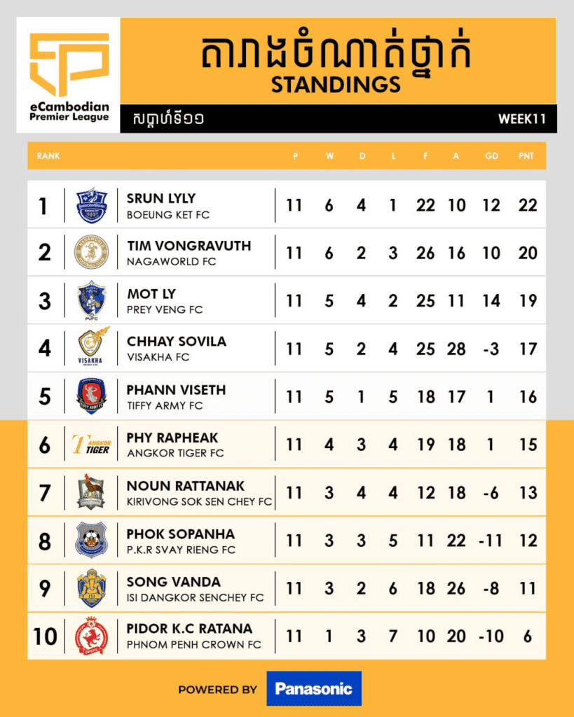 ការប្រកួតពានរង្វាន់កីឡាអេឡិចត្រូនិចកម្ពុជា eCambodian Premier League រដូវកាលឆ្នាំ២០២៣-២៤ បានបញ្ចប់ការប្រកួតសប្តាហ៍ទី១១ ហើយកាលពីថ្ងៃទី២៤ ខែវិច្ឆិកា ឆ្នាំ២០២៣ កន្លងទៅ ក្នុងនោះឃើញថាកីឡាករ ស្រ៊ុន លីលី តំណាងបឹងកេត បន្តឈរកំពូលតារាងមាន២២ពិន្ទុ ខណៈកីឡាករពិដោរ កុរច័ន្ទរតនា របស់ភ្នំពេញក្រោន ឈរនៅបាតតារាងត្រឹមតែ៦ពិន្ទុ។