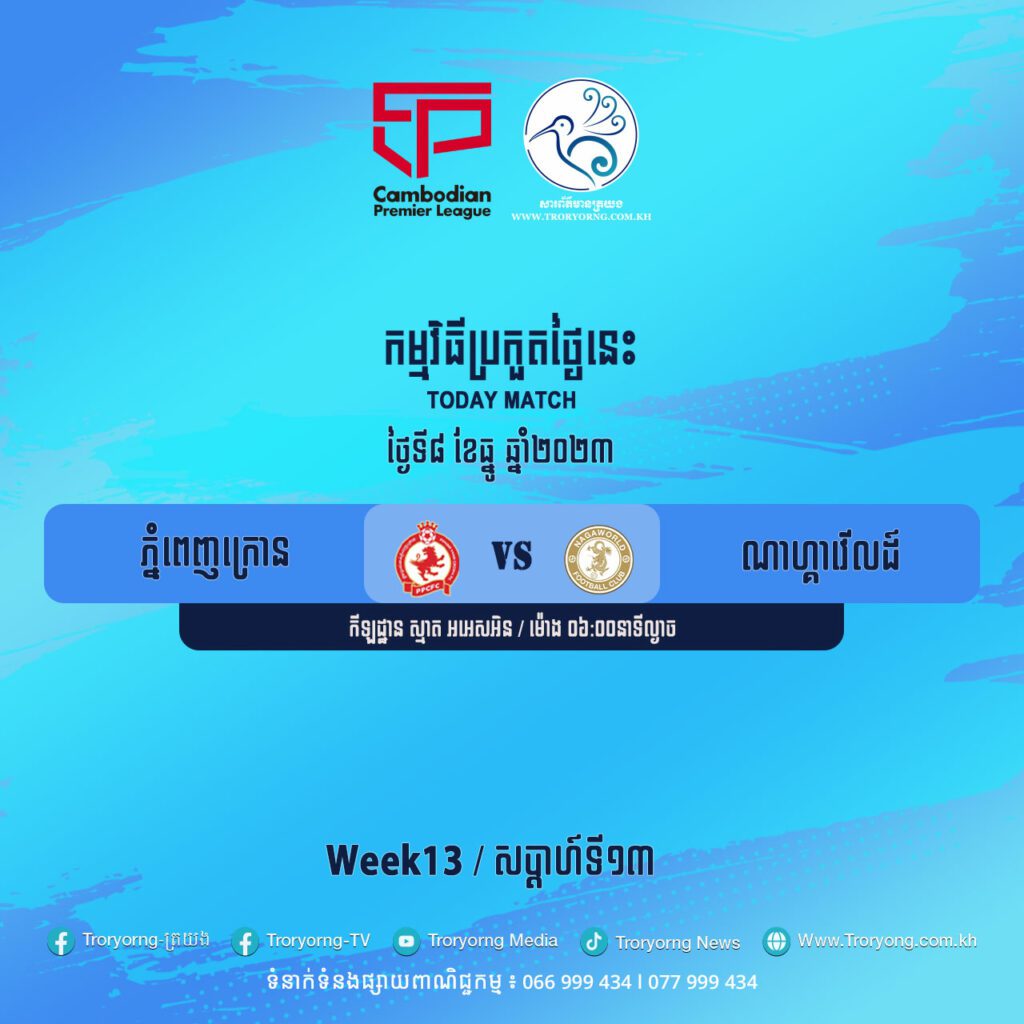ពានរង្វាន់ជម្រើសជើងឯកខេមបូឌានព្រីមៀរលីគ ឆ្នាំ២០២៣/២៤ សប្តាហ៍ទី១៣ នឹងចាប់ផ្តើមនៅល្ងាចថ្ងៃទី៨ ខែធ្នូនេះ ដោយជាជំនួបរវាងក្លិបបាល់ទាត់ភ្នំពេញក្រោន និងក្លិបបាល់ទាត់ណាហ្គាវើលដ៍ ក្នុងកីឡដ្ឋាន Smart RSN នៅវេលាម៉ោង ៦:៣០នាទីល្ងាច។