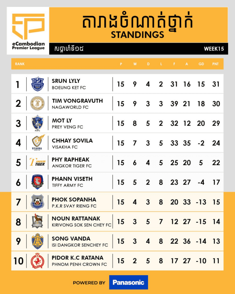 ការប្រកួតកីឡាអេឡិចត្រូនិច E-Cambodian Premier League 2023-24 បានបញ្ជប់ការប្រកួតសប្តាហ៍ទី១៥ ហើយកាលពីថ្ងៃទី២២ ខែឆ្នូ ឆ្នាំ២០២៣ កន្លងទៅ ក្នុងនោះឃើញថាកីឡាករ ស្រ៊ុន លីលី តំំំណាងបឹងកេត បន្តឡើងឈរកំពូលតារាង ក្រោយយកឈ្នះលើកីឡាករ ផាន់ វិសិទ្ធ ដោយលទ្ធផល ៣-២ តាមពីក្រោយដោយកីឡាករ ទឹម វង្សរ៉ាវុធ តំណាងណាហ្គាវើលដ៍ មាន៣០ពិន្ទុក្នុងដៃ ឈរនៅលេខ២។