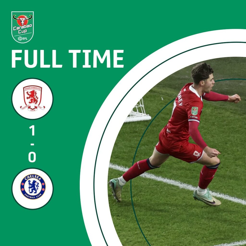 ក្រុមបាល់ទាត់ Chelsea ក្រោមការដឹកនាំរបស់លោក Mauricio Pochettino បានរងបរាជ័យក្រោមថ្វីជើង Middlesbrough ក្នុងលទ្ធផល ១-០ នៅវគ្គពាក់កណ្តាលផ្តាច់ព្រ័ត្រ ជើងទី១ នៃពានរង្វាន់ Carabao Cup ឬ EPL Cup ឆ្នាំ ២០២៣-២៤ នៅកីឡដ្ឋាន Riverside Stadium កាលពីរាត្រីថ្ងៃទី៩ ខែមករា។