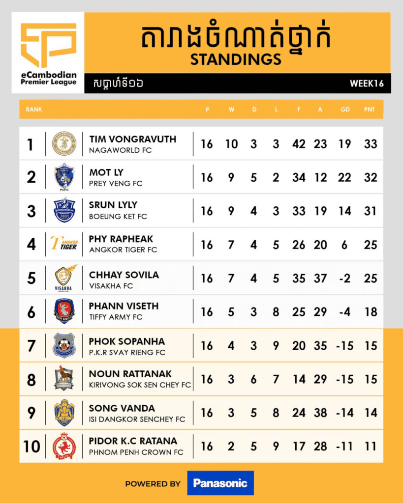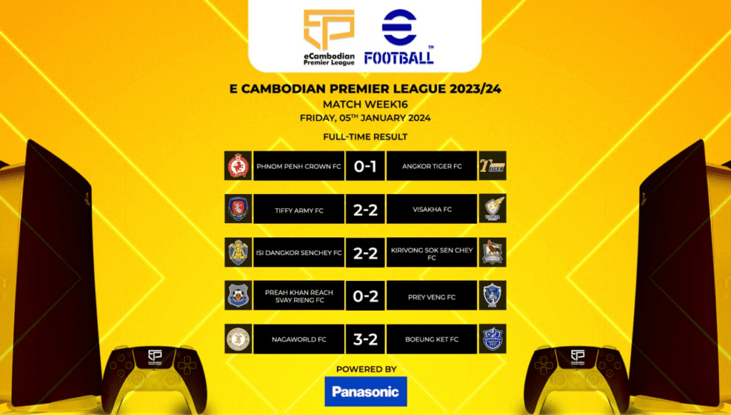 ការប្រកួតពានរង្វាន់ eCambodian Premier League ឆ្នាំ២០២៣ បានបញ្ចប់ការប្រកួតសប្តាហ៍ទី១៦ ហើយកាលពីថ្ងៃទី៥ ខែមករា ឆ្នាំ២០២៤ កន្លងទៅ ក្នុងនោះកីឡាករ ទឹម វង្សរ៉ាវុធ របស់ណាហ្គាវើលដ៍ បន្តឈរកំពូលតារាង ក្រោយយកឈ្នះកីឡាករ ស្រ៊ុន លីលី ក្នុងលទ្ធផល ៣-២ និងកំពុងបន្តនាំមុខគេក្នុងនាមជាកីឡាករដែលរកគ្រាប់បាល់ច្រើនជាងគេសរុប ៤២គ្រាប់។