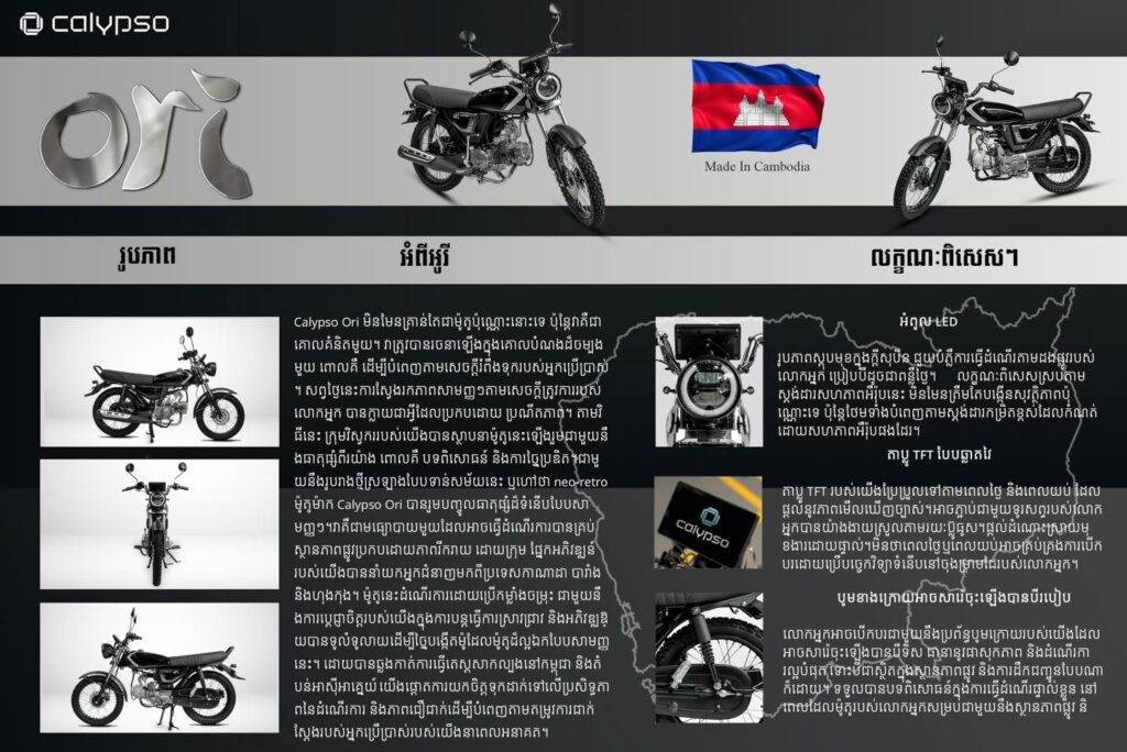 កាលីបសូ អូរី – Calypso ORI 125cc ដែលជាផលិទ្ធផលម៉ូតូថ្មី វាត្រូវបានរចនាឡើងនៅលើកដីរបស់ប្រទេសកម្ពុជា Made in Cambodia ដែលវាត្រូវបានរចនាឡើងសម្រាប់ប្រជាជនកម្ពុជា ជាមួយនឹងរូបរាងដ៏ទាកទាញ់ សាមញ្ញ ស៊ីវីល័យ រួមជាមួយតម្លៃសមរម្យ។