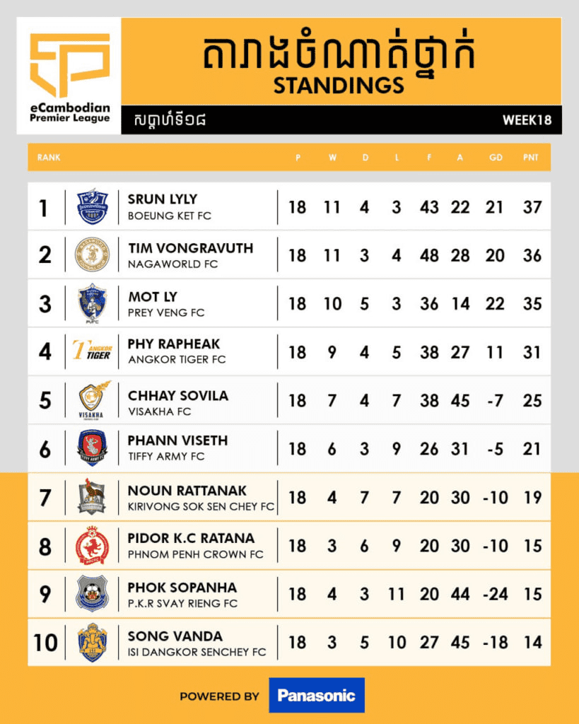 ទី១. កីឡាករ ស្រ៊ុន លីលី របស់បឹងកេត ឈរលេខ១កំពូតារាង ក្រោយឆ្លងកាត់ ១៨ប្រកួតឈ្នះ១១ ស្មើ៤ និងចាញ់៣ មាន៣៧ពិន្ទុ។
