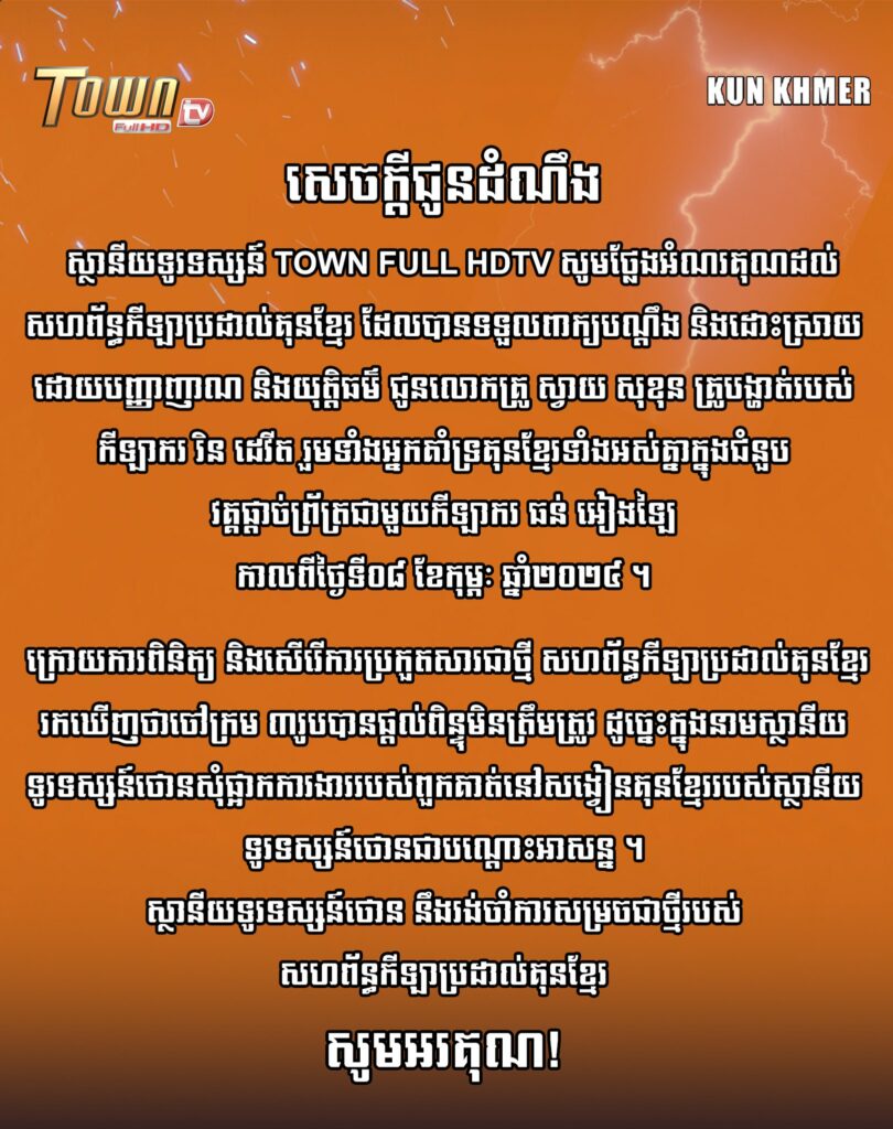ស្របពេលស្ថានីយទូរទស្សន៍ TOWN FULL HDTV បានថ្លែងជុំវិញករណីខាងលើដូច្នេះថា៖«សូមថ្លែងអំណរគុណដល់ សហព័ន្ធកីឡាប្រដាល់គុនខ្មែរ ដែលបានទទួលពាក្យបណ្តឹង និងដោះស្រាយ ដោយបញ្ញាញាណ និងយុត្តិធម៌ ជូនលោកគ្រូ ស្វាយ សុខុន គ្រូបង្ហាត់របស់កីឡាករ រិន ដេវីត រួមទាំងអ្នកគាំទ្រគុនខ្មែរទាំងអស់គ្នាក្នុងជំនួប វគ្គផ្តាច់ព្រ័ត្រជាមួយកីឡាករ ធន់ អៀងឡៃ កាលពីថ្ងៃទី០៨ ខែកុម្ភៈ ឆ្នាំ២០២៤»។