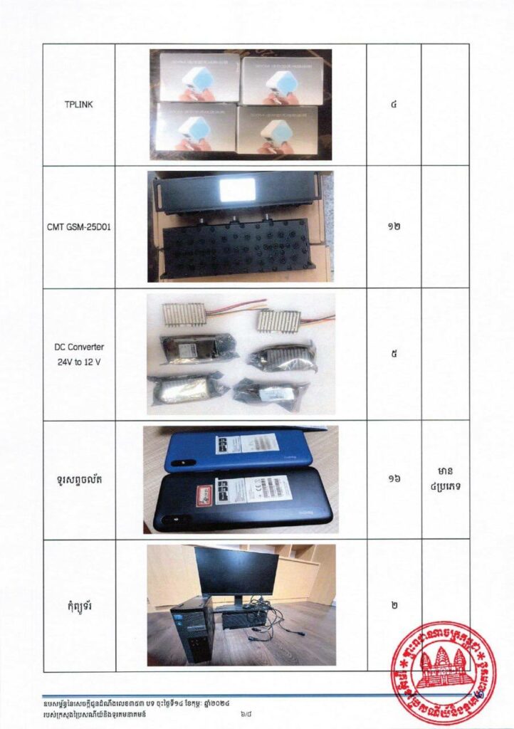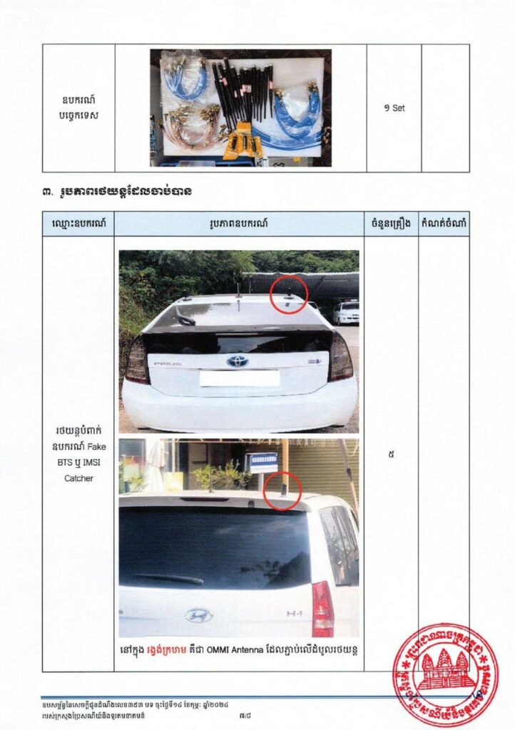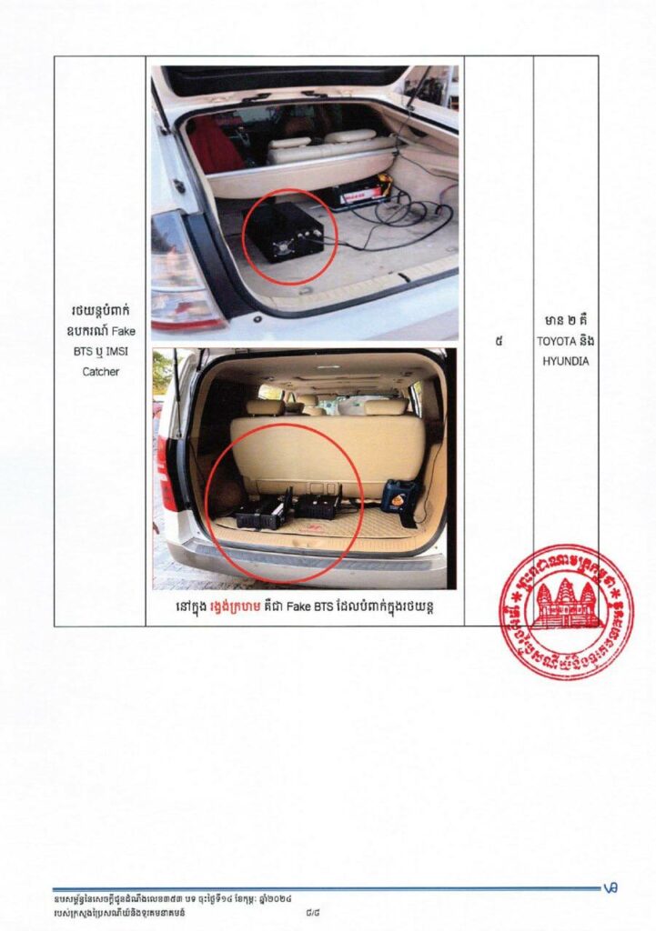 ដោយកំណត់បាននូវមុខសញ្ញានេះ នៅថ្ងៃទី១០ ខែមករា ឆ្នាំ២០២៤ ន.ទ.ក. សហការជាមួយសមត្ថកិច្ច ខេត្តព្រះសីហនុ បានចុះត្រួតពិនិត្យ ក្រុមហ៊ុន ហ្សីចែ រេនជា ខា វ៉សស៊ីង សឺវីស ឯ.ក មានអាសយដ្ឋានស្ថិតនៅសង្កាត់ លេខ ៣ ក្រុងព្រះសីហនុ ខេត្តព្រះសីហនុ ហើយបានចាប់យកវត្ថុតាង រួមមាន រថយន្តបំពាក់ឧបករណ៍ Fake BTS ៥ គ្រឿង ឧបករណ៍ Fake BTS ១៩ គ្រឿង ឧបករណ៍កាត់ផ្តាច់សេវា (Jammer) ៣ គ្រឿង និងគ្រឿងបង្គុំផ្សេងៗទៀត ព្រមទាំង ឃាត់ខ្លួនអ្នកពាក់ព័ន្ធ បញ្ជូនទៅស្នងការដ្ឋាននគរបាលខេត្តព្រះសីហនុ។