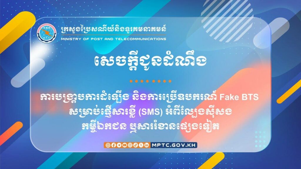 ក្រសួងប្រៃសណីយ៍និងទូរគមនាគមន៍ (ក.ប.ទ.) បានបញ្ជាក់ថា ដោយមានអំពើមិន ប្រក្រតីនៃការផ្ញើសារខ្លី (SMS) ផ្សព្វផ្សាយអំពីល្បែងស៊ីសង កម្ចីឯកជន ឬសាររំខានផ្សេងទៀត ទៅកាន់ទូរសព្ទចល័ត របស់អ្នកប្រើប្រាស់ និយ័តករទូរគមនាគមន៍កម្ពុជា (ន.ទ.ក.) បានស្រាវជ្រាវ និងរកឃើញថា សកម្មភាពទាំងនេះត្រូវ បានធ្វើឡើងតាមរយៈការប្រើ ឧបករណ៍បញ្ជូនទទួលក្លែងក្លាយ (Fake Base Transceiver Station – Fake BTS) ដែលបានបង្កការរំខានដល់អ្នកប្រើប្រាស់ និងមានផលប៉ះពាល់ដល់គុណភាពសវា ឯកជនភាពនិងសុវត្ថិភាពទិន្នន័យ ព្រមទាំងសណ្ដាប់ធ្នាប់សង្គមនិងសន្តិសុខជាតិ។