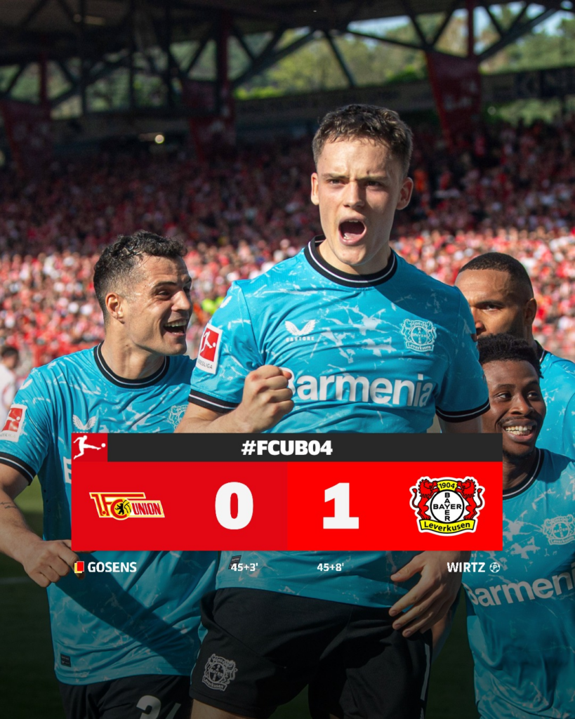 ក្រុមបាល់ទាត់ Bayer Leverkusen ក្រោមការដឹកនាំរបស់លោក Xabi Alonso បន្តឈរកំពូលតារាងនៅលីគកំពូលអាល្លឺម៉ង់ Bundesliga រដូវកាល ២០២៣-២៤ ក្រោយវាយបកយកឈ្នះ Union Berlin ក្នុងលទ្ធផល ១-០ នៅកីឡដ្ឋាន Alte Foersterei កាលពីថ្ងៃទី៦ ខែមេសា ឆ្នាំ២០២៤។