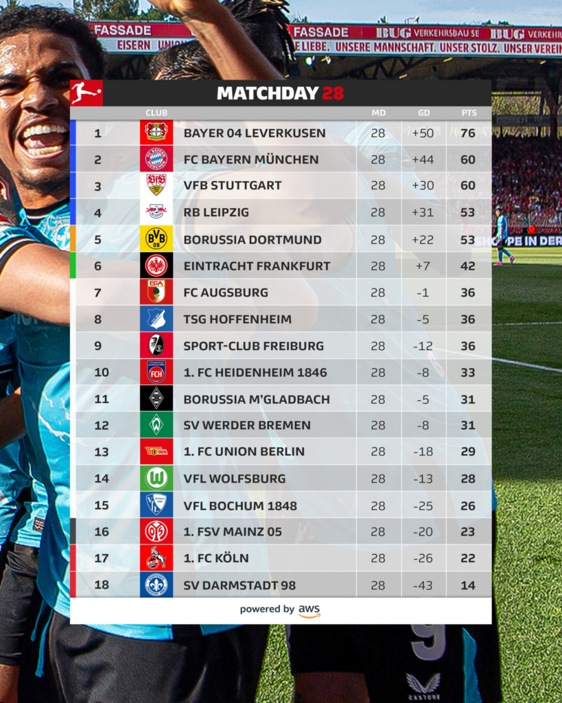 តារាងចំណាត់ថ្នាក់ Bundesliga គិតត្រឹមសប្តាហ៍ទី២៨៖