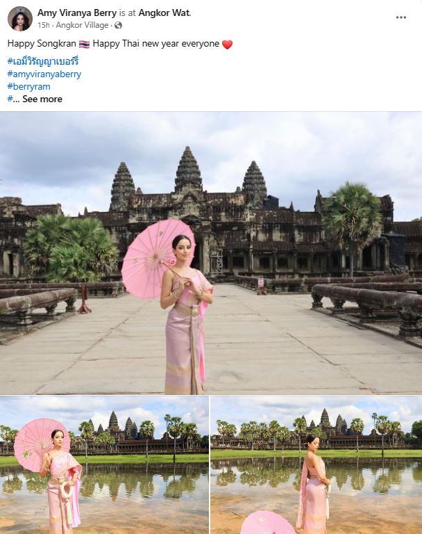 ស្រីស្អាត Amy Viranya Berry ដែលមានការសិក្សាខ្ពង់ខ្ពស់ព្រោះទៅរៀនដល់ក្រុងឡុងដ៍ ប្រទេសអង់គ្លេស នៅសកលវិទ្យាល័យ London Colleague of Fashion ប៉ុន្តែគំនិតនិងការគិតបែរជាទាបជាងក្មេងរៀនបឋមរូបនេះ បានសរសេរថា៖ «Happy Songkran Happy Thai New Year Everyone» បើគ្រាន់តែពាក្យប៉ុណ្ណឹង វាមិនមានអ្វីខុសនោះទេ ប៉ុន្តែអ្វីដែលពលរដ្ឋខ្មែរចាប់កំហុសនោះគឺនៅត្រង់ នាងបានបង្ហោះរូបថតរបស់ខ្លួននៅមុខប្រាសាទអង្គរវត្តទៅវិញទេ។