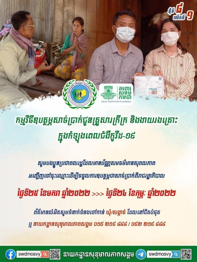 រាជរដ្ឋាភិបាល បានចំណាយថវិកាជាតិសរុបចំនួន ៥ ៤៣៨ ៤៨៦ ៤១៩ ០០០ រៀល ឬស្មើនឹង ១ ៣៥៩,៦២ លានដុល្លារអាមេរិក សម្រាប់ កម្មវិធីឧបត្ថម្ភសាច់ប្រាក់ជូនដល់គ្រួសារក្រីក្រ និងងាយរងគ្រោះក្នុងអំឡុងពេលប្រយុទ្ធនឹងជំងឺកូវិដ–១៩ ប្រមាណ ៧សែនគ្រួសារ ស្មើនឹង ២,៨ លាននាក់ រយៈពេល ៤៣ ខែ និងការអនុវត្តយុទ្ធសាស្ត្រចាកចេញពីកម្មវិធីមានរយៈពេល ៣ ខែ។ នេះបើយកតាមសេចក្ដីប្រកាសព័ត៌មានរបស់ក្រុមប្រឹក្សាជាតិគាំពារសង្គមកាលពី ថ្ងៃទី ៣០ ខែកក្កដា ឆ្នាំ ២០២៤។