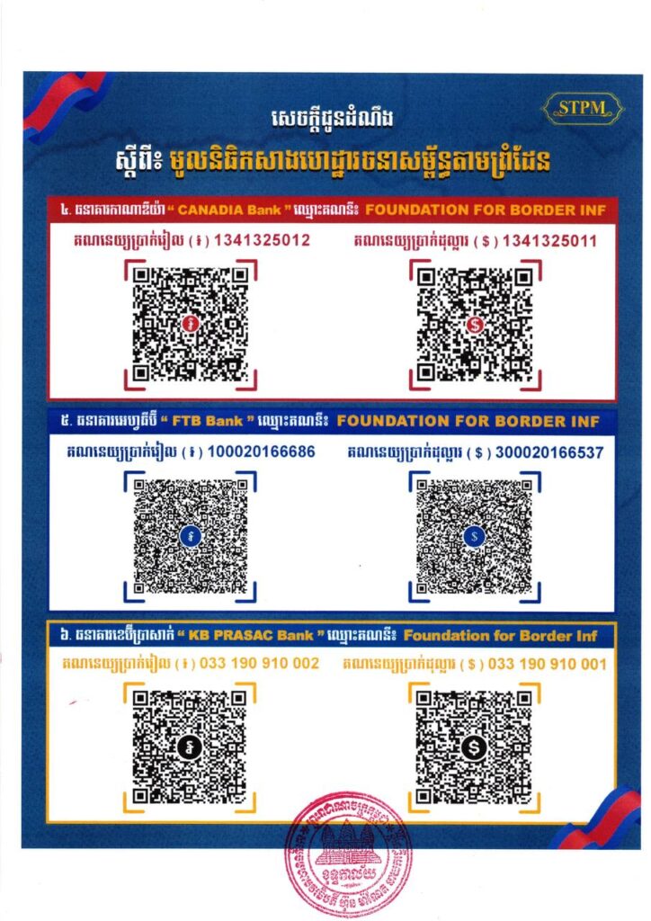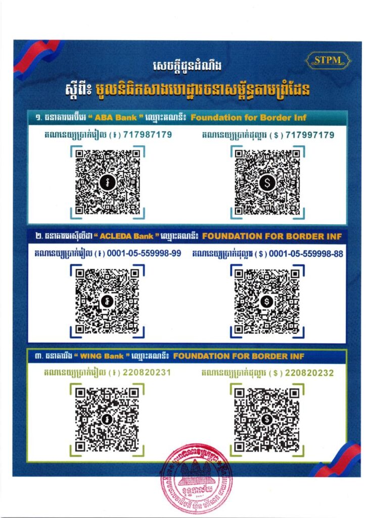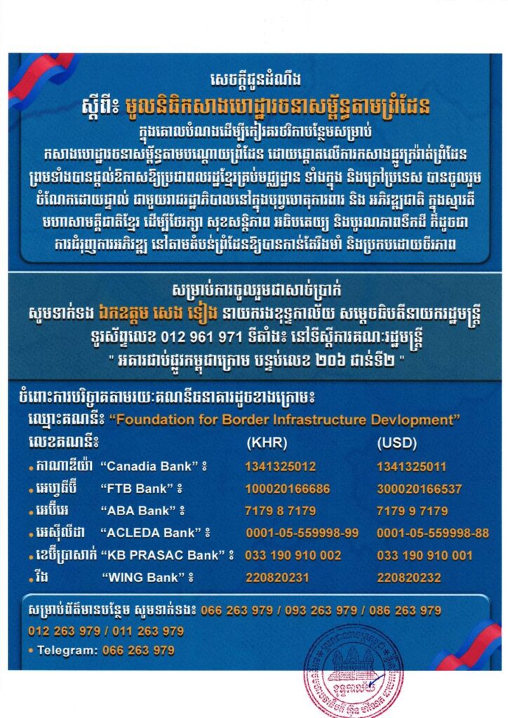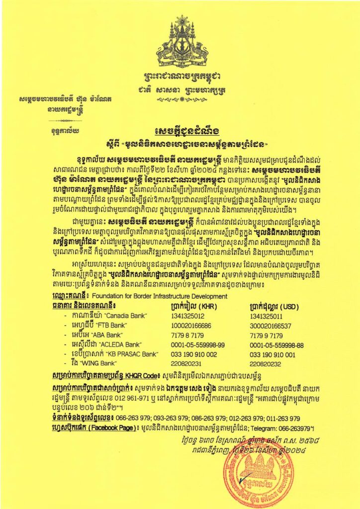 ជាមួយគ្នានេះ សម្ដេចធិបតី នាយករដ្ឋមន្ត្រី ក៏បានអំពាវនាវដល់បងប្អូនប្រជាពលរដ្ឋខ្មែរទាំងក្នុង និងក្រៅប្រទេស ឲ្យចូលរួមបរិច្ចាគវិភាគទានឱ្យបានផុលផុសតាមការស្ម័គ្រចិត្តក្នុង “មូលនិធិកសាងហេដ្ឋារចនា សម្ព័ន្ធតាមព្រំដែន” សំដៅរួមគ្នាក្នុងធ្លុងមហាសាមគ្គីជាតិខ្មែរ។