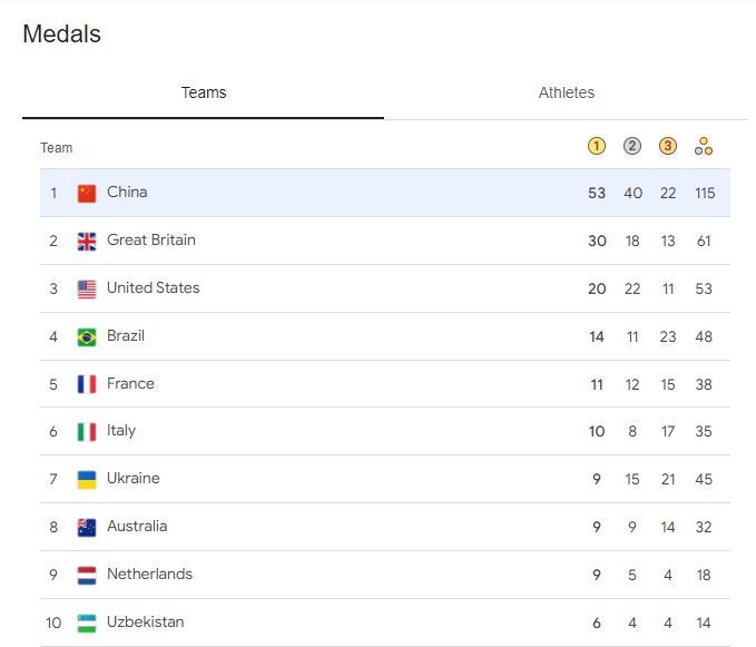 ប្រទេសចិន ឈរកំពូលតារាងមេដាយសរុប ដោយដណ្ដើមបាន លើស១០០គ្រឿងមុនគេ ក្នុងការប្រកួតកីឡាប៉ារ៉ាឡាំពិករដូវក្តៅ ឆ្នាំ២០២៤ (Paralympics Games Paris 2024) នៅទីក្រុងប៉ារីស ប្រទេសបារាំង ខណ:តាមពីក្រោយដោយអង់គ្លេស សរុប ៦១គ្រឿង និងអាមេរិក សរុប ៥៣គ្រឿង គិតត្រឹមម៉ោង ៩:០០នាទីព្រឹកថ្ងៃទី៤ កញ្ញា ២០២៤។