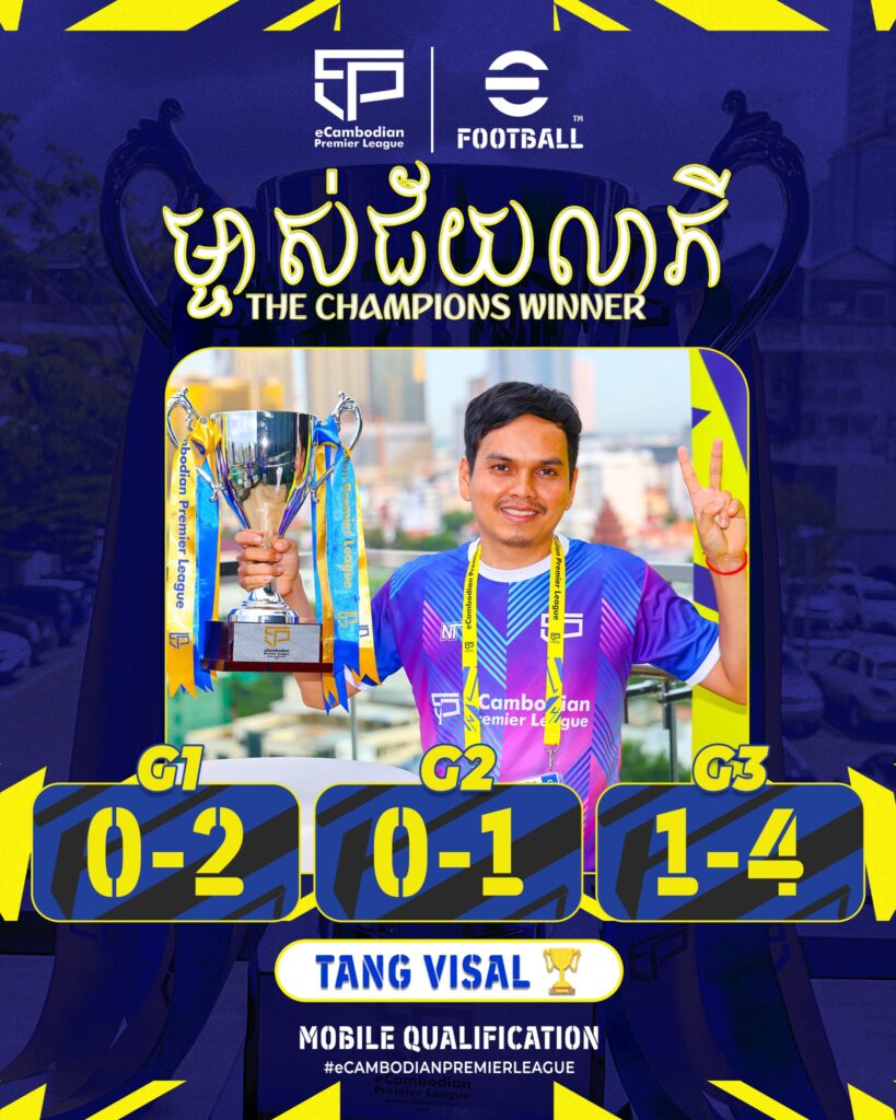 កីឡាករ តាំង វិសាល បានក្លាយជាម្ចាស់ជ័យលាភីជើងឯកនៃ អុីខេមបូឌានព្រីមៀរលីគ eCambodian Premier League 2024/25 – Qualification ឆ្នាំ២០២៤/២៥ វគ្គជម្រុះ វិញ្ញាសា eFootball Mobile (ទូរស័ព្ទ)។
