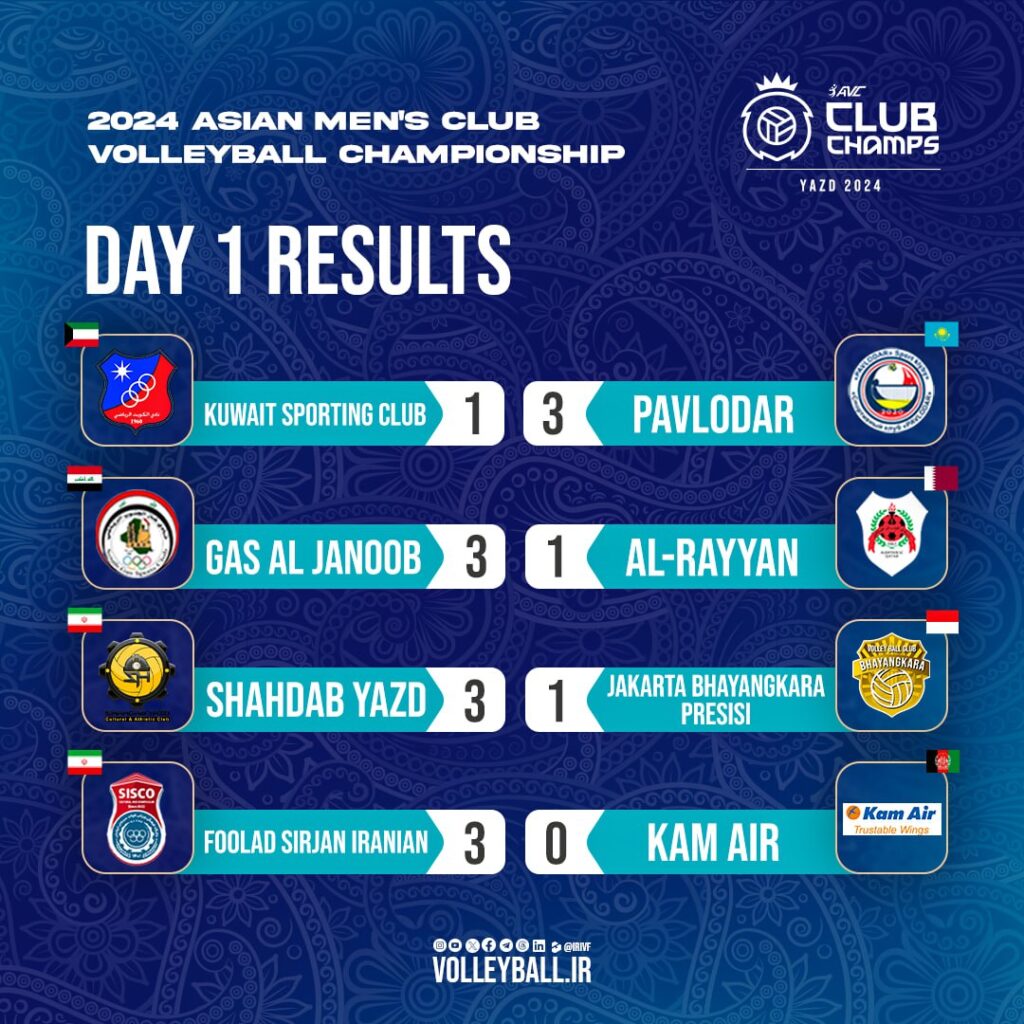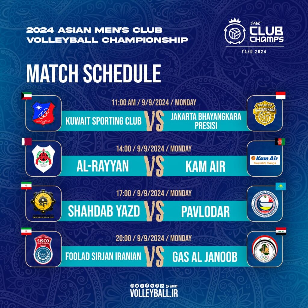 ព្រឹត្តិការណ៍ប្រកួតពានរង្វាន់ប្រចាំទ្វីបអាស៊ី Asian Men’s Club Volleyball Championship 2024 ដែលប្រទេសអ៊ីរ៉ង់ ទទួលរៀបចំធ្វើជាម្ចាស់ផ្ទះ នៅទីក្រុង Yazd នឹងបន្តប្រកួតចំនួន ៤គូទៀតនៅថ្ងៃទី៩ កញ្ញា ២០២៤នេះ។