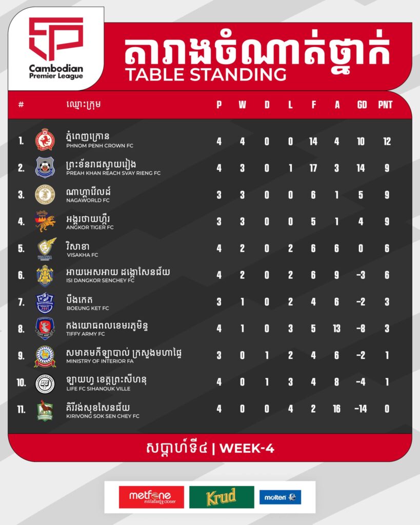 តារាងចំណាត់ថ្នាក់ ត្រឹមសប្ដាហ៍ទី៤៖
