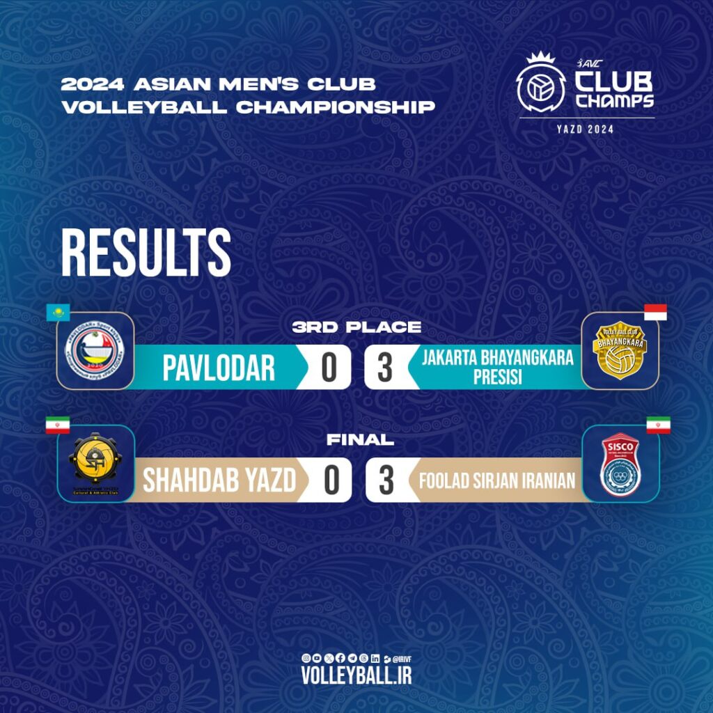 ក្រុមបាល់ទះ Foolad Sirjan មកពីអ៊ីរ៉ង់ យកឈ្នះក្រុម Shahdab Yazd មកពីអ៊ីរ៉ង់ ដូចគ្នា ដណ្ដើមបានមេដាយមាស នៃការប្រកួតបាល់ទះជើងឯកប្រចាំទ្វីបអាស៊ី 2024 Asian Men’s Club Volleyball Championship ដែលបានរៀបចំឡើងនៅទីក្រុង Yazd ប្រទេសអ៊ីរ៉ង់។