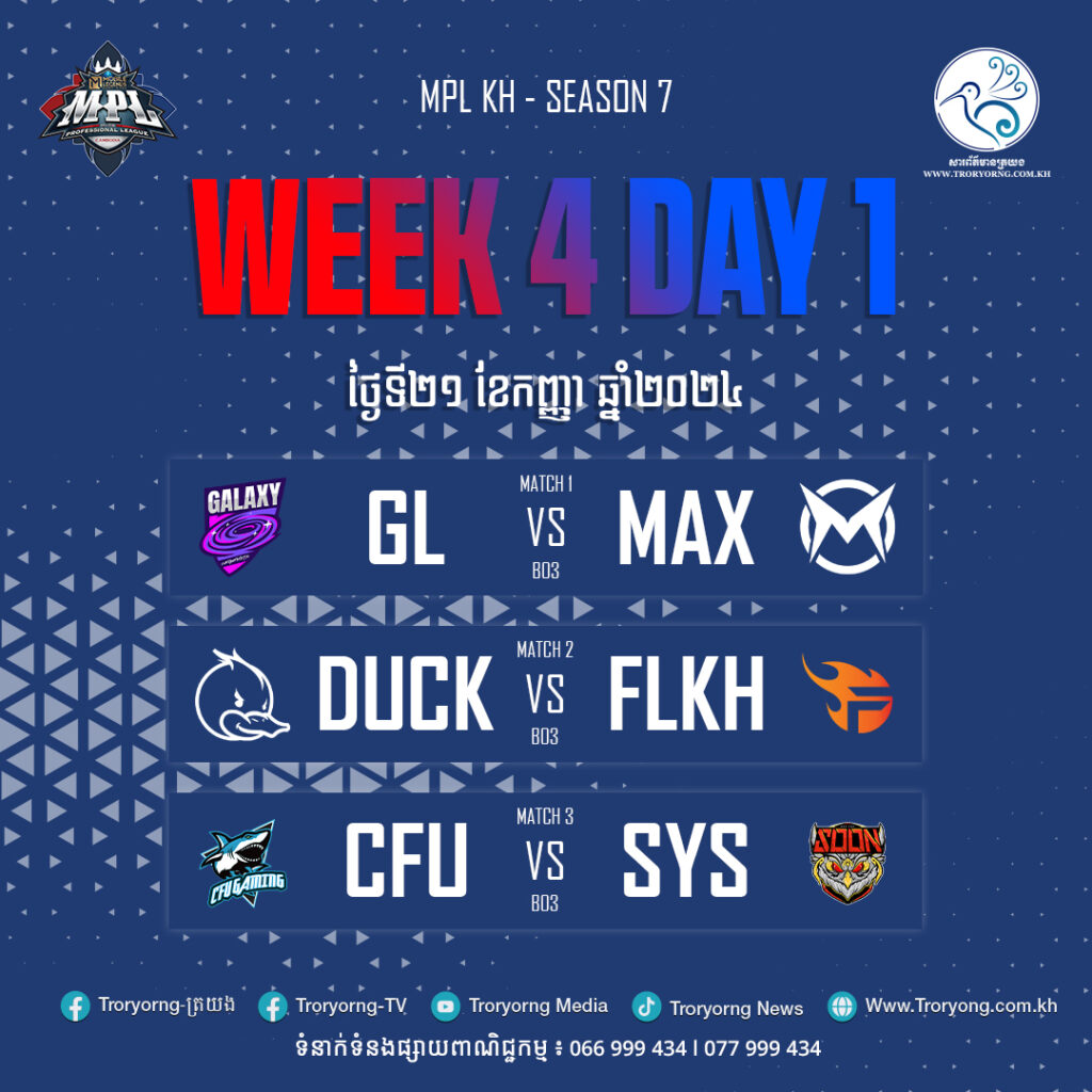 ក្រុមកំពូលតារាង CFU Gaming នឹងត្រូវក្រុមការពារតំណែងជើងឯក See You Soon ក្នុងជំនួបសប្ដាហ៍ទី៤ ថ្ងៃទី២១ កញ្ញានេះ ប្រកួតគូចុងក្រោយ នៃការប្រកួត The Mobile Legends: Bang Bang Professional League – Cambodia (MPL-KH) រដូវកាលទី៧។