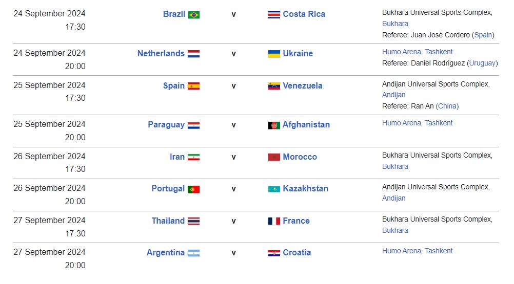 ក្រុមបាល់ទាត់ហ្វូតសាលបុរសជម្រើសជាតិថៃ នឹងត្រូវជួបក្រុមបាល់ទាត់ហ្វូតសាលបុរសជម្រើសជាតិបារាំង នៅវគ្គ ១៦ក្រុមចុងក្រោយ នៅថ្ងៃទី២៧ កញ្ញានេះ នៃពានរង្វាន់បាល់ទាត់ហ្វូតសាលជើងឯកពិភពលោក 2024 FIFA Futsal World Cup នៅក្នុងសាល Bukhara Universal Sports Complex វេលាម៉ោង ១៧:៣០ល្ងាច។
