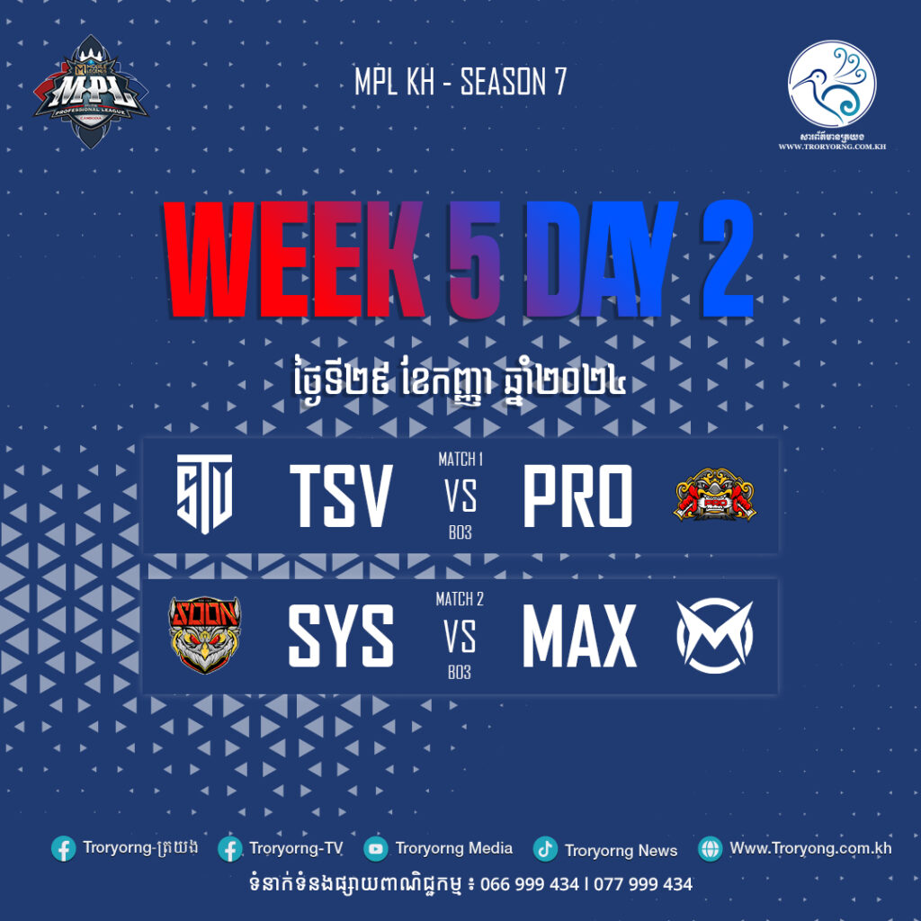 Team SV ជួប Pro ESports ខណ: See You Soon ជួប Tem Max ក្នុងជំនួបសប្ដាហ៍ទី៥ នៃការប្រកួត The Mobile Legends: Bang Bang Professional League – Cambodia (MPL-KH) រដូវកាលទី៧ ថ្ងៃនេះ។