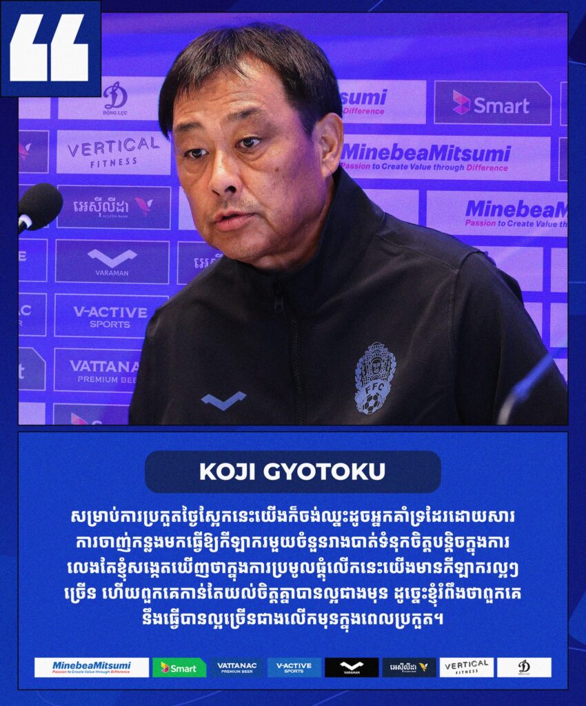 លោក KOJI GYOTOKU គ្រូបង្វឹកក្រុមជម្រើសកម្ពុជា ក៏បានបង្ហាញចំណាប់អារម្មណ៍ ត្រៀមការប្រកួតរវាងក្រុមជម្រើសជាតិកម្ពុជា និងឆាយនីសតៃបុិ នៅល្ងាចនេះថា៖