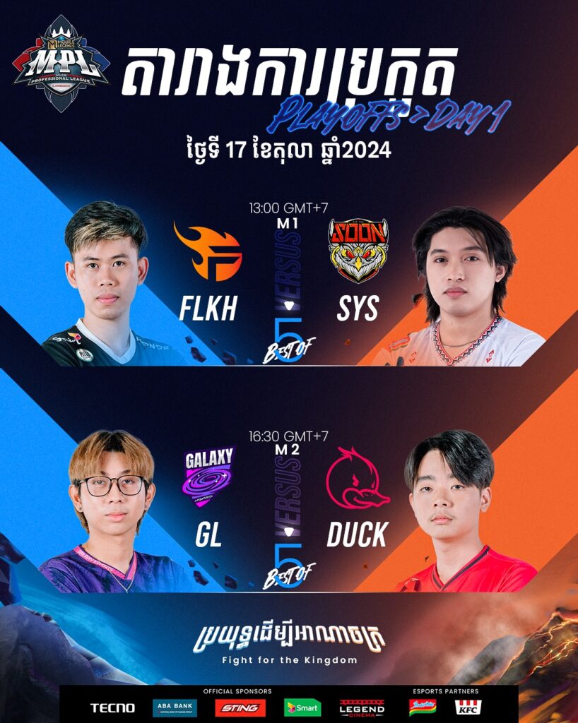 ថ្ងៃប្រកួត MPL KH S7 វគ្គ Playoffs ដែល Flash KH ត្រូវប៉ះជាមួយ See You Soon ខណៈដែល Galaxy Legends ត្រូវប្រកួតជាមួយ Duck Rice Esport ដោយការប្រកួតនៅថ្ងៃទី១៧ ដល់ ២០ ខែតុលា ឆ្នាំ២០២៤ ម៉ោង ១:៣០នាទីរសៀលតទៅ ទីតាំងនៅកោះពេជ្រស៊ីធីហល។