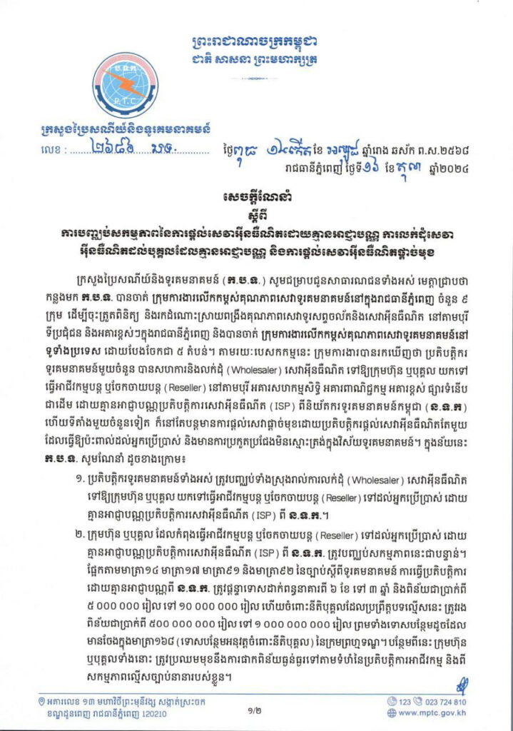 ភ្នំពេញ៖ ក្រសួងប្រៃសណីយ៍និងទូរគមនាគមន៍ (ក.ប.ទ.) បានចេញសេចក្តីណែនាំ ឱ្យបញ្ឈប់សកម្មភាពនៃការផ្តល់សេវាអ៊ីនធឺណិត ដោយគ្មានអាជ្ញាបណ្ណ ការលក់ដុំសេវា អ៊ីនធឺណិតដល់បុគ្គលដែលគ្មានអាជ្ញាបណ្ណ និងការផ្តល់សេវាអ៊ីនធឺណិតផ្តាច់មុខ។