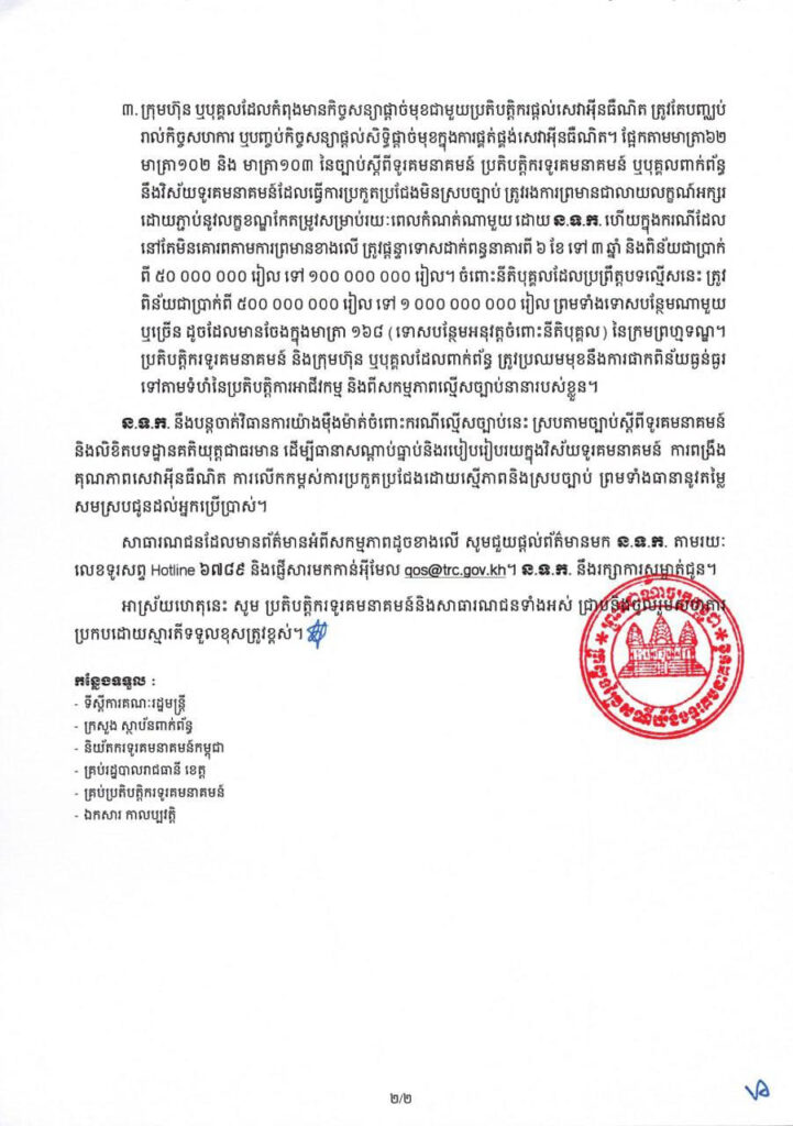 ២. ក្រុមហ៊ុន ឬបុគ្គល ដែលកំពុងធ្វើអាជីវកម្មបន្ត ឬចែកចាយបន្ត (Reseller) ទៅដល់អ្នកប្រើប្រាស់ ដោយគ្មានអាជ្ញាបណ្ណប្រតិបត្តិការសេវាអ៊ីនធឺណីត (ISP) ពី ន.ទ.ក. ត្រូវបញ្ឈប់សកម្មភាពនេះជាបន្ទាន់។ ផ្អែកតាមមាត្រា១៤ មាត្រា១៧ មាត្រា៩១ និងមាត្រា៩២ នៃច្បាប់ស្តីពីទូរគមនាគមន៍ ការធ្វើប្រតិបត្តិការដោយគ្មានអាជ្ញាបណ្ណពី ន.ទ.ក. ត្រូវផ្តន្ទាទោសដាក់ពន្ធនាគារពី ៦ ខែ ទៅ ៣ ឆ្នាំ និងពិន័យជាប្រាក់ពី ៥ ០០០ ០០០ រៀល ទៅ ១០ ០០០ ០០០ រៀល ហើយចំពោះនីតិបុគ្គលដែលប្រព្រឹត្តបទល្មើសនេះ ត្រូវរងពិន័យជាប្រាក់ពី ៥០០ ០០០ ០០០ រៀល ទៅ ១ ០០០ ០០០ ០០០ រៀល ព្រមទាំងទោសបន្ថែមដូចដែលមានចែងក្នុងមាត្រា១៦៨ (ទោសបន្ថែមអនុវត្តចំពោះនីតិបុគ្គល) នៃក្រមព្រហ្មទណ្ឌ។ បន្ថែមពីនេះ ក្រុមហ៊ុន ឬបុគ្គលទាំងនោះ ត្រូវប្រឈមមុខនឹងការផាកពិន័យធ្ងន់ធ្ងរទៅតាមទំហំនៃប្រតិបត្តិការអាជីវកម្ម និងពីសកម្មភាពល្មើសច្បាប់នានារបស់ខ្លួន។
