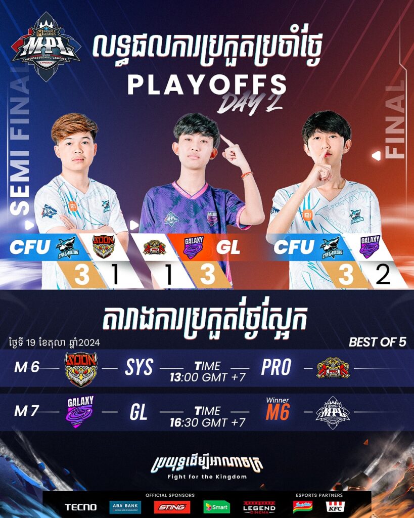 រំលឹកថា សម្រាប់ក្រុមដែលត្រូវបានឡើងមកកាន់ការប្រកួតវគ្គវគ្គ Playoffs មាន ៦ក្រុមខ្លាំងរួមមាន៖ ក្រុម See You Soon, Galaxy Legends, Team Flash KH, CFU Gaming, Duck Rice Esport និង PRO Esports បន្ទាប់ពីទម្លាក់ក្រុម Team SV និង Team Max។