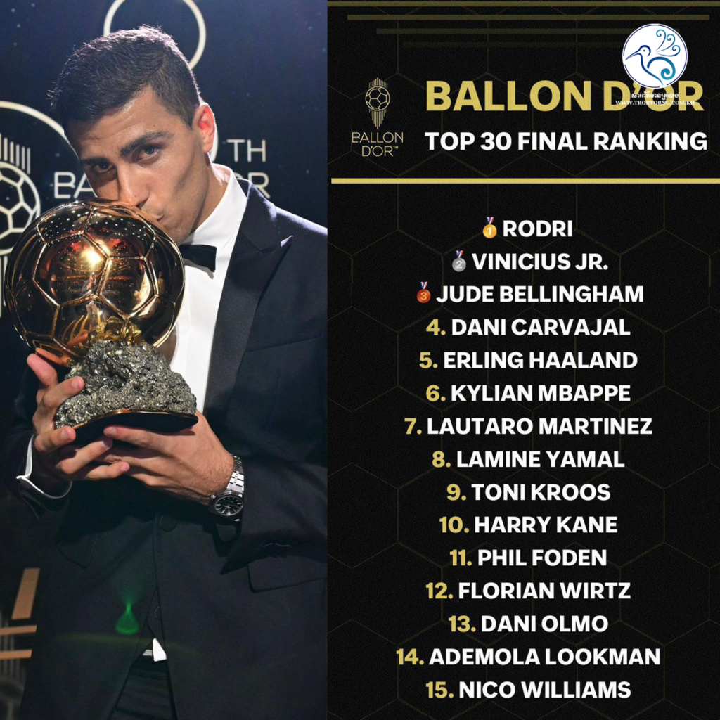 នៅរាត្រីថ្ងៃទី២៨ ឈានចូលព្រឹកថ្ងៃទី២៩ ខែតុលា ឆ្នាំ២០២៤ ខ្សែបម្រើឆ្នើម Rodri សមាជិករបស់ Man City និងក្រុមជម្រើសជាតិអេស្ប៉ាញ បានក្លាយជាម្ចាស់ពាន Ballon d’Or 2024 ដែលរៀបចំដោយទស្សនាវដ្តីបារាំង France Football ក្រោយប្រជែងឈ្នះ Vinicius Jr និង Jude Bellingham។
