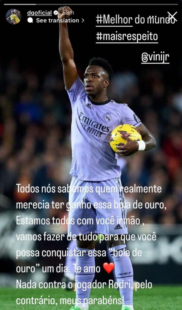 - Richarlison៖ «យើងទាំងអស់គ្នាដែលរស់នៅក្នុងពិភពបាល់ទាត់ ទន្ទឹងរង់ចាំពានរង្វាន់បុគ្គលដោយក្តីបារម្ភជារៀងរាល់រដូវកាល។ ថ្ងៃនេះប្រជាជនប្រេស៊ីលទាំងអស់ដែលស្រលាញ់កីឡាបាល់ទាត់បានភ្ញាក់ឡើងដោយរំពឹងថានឹងបានឃើញកីឡាករម្នាក់ទៀតមកពីប្រទេសរបស់យើងឈ្នះពានរង្វាន់សម្រាប់កីឡាករល្អបំផុតនៅក្នុងពិភពលោក។ ប៉ុន្តែជាអកុសល Vini មិនទទួលយក Ballon d’Or នេះទេ។ វាគួរឲ្យអាម៉ាស់ ហើយអ្នកចាញ់តែម្នាក់គត់ក្នុងថ្ងៃនេះគឺបាល់ទាត់»។