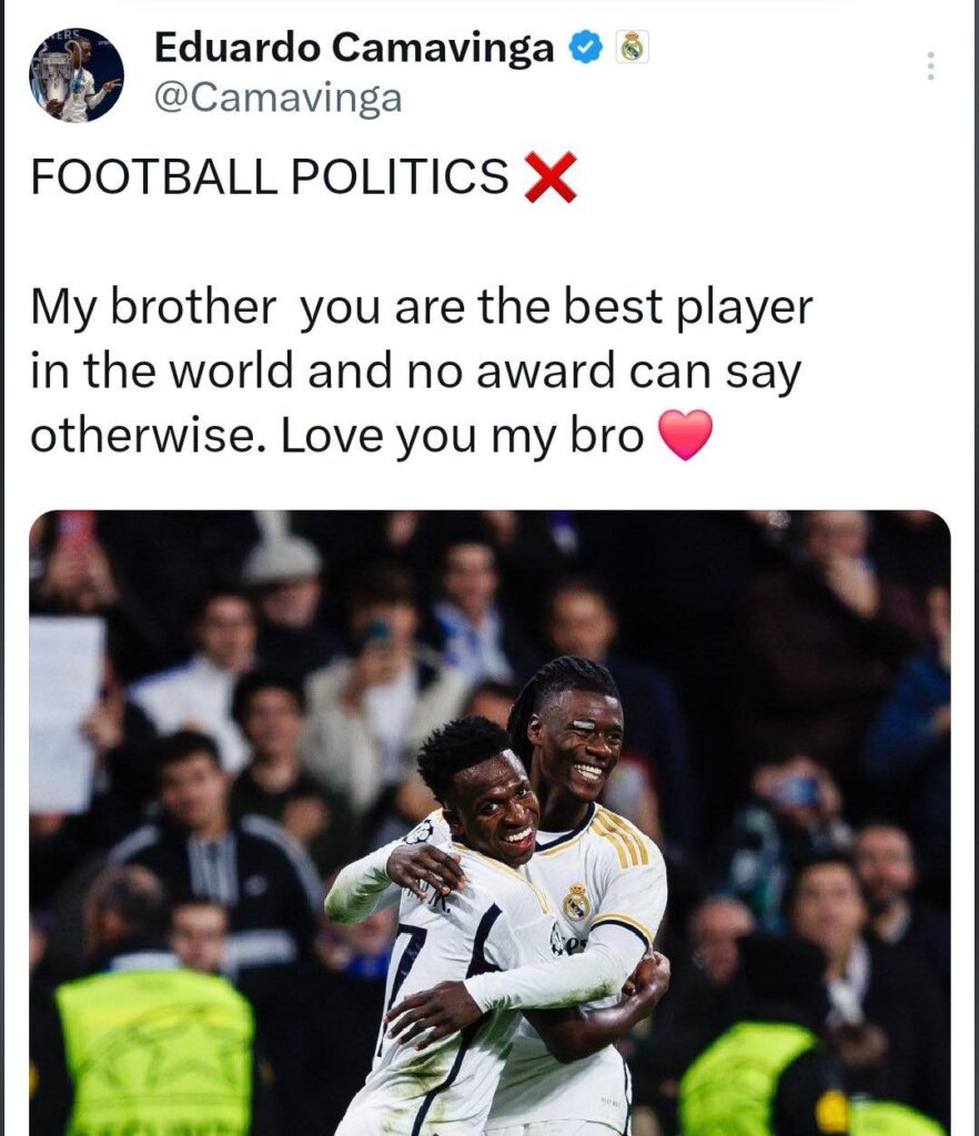 - Douglas Luiz សមាជិក Juventus ថ្លែងថា៖ «Vinicius Jr គឺជាកីឡាករល្អបំផុតលើពិភពលោក។ ការគោរពកាន់តែច្រើន។ យើងទាំងអស់គ្នាដឹងថាអ្នកណាសមនឹងឈ្នះ Ballon d’Or នេះ»។