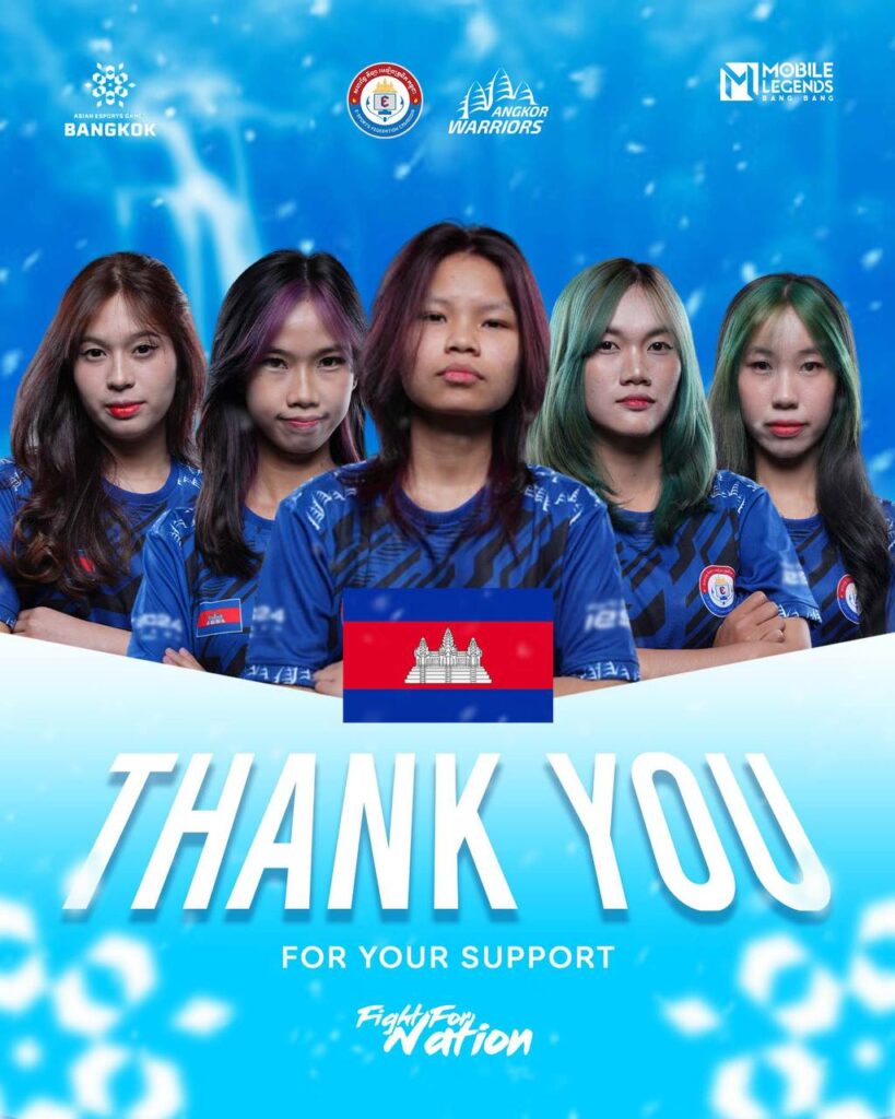 ក្រុមកីឡាករនិងកីឡាការិនី ជម្រើសជាតិ (ANGKOR WARRIORS ) បញ្ចប់ភារកិច្ចនៅក្នុងព្រឹត្តិការណ៍ Asian Esports Games 2024 សម្រាប់វិញ្ញាសា Mobile Legend Bang Bang ផ្នែកនារី ត្រឹមចំណាត់ថ្នាក់លេខ៤ ក្រោយចាញ់ក្រុមនារីចិន។