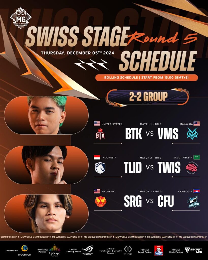 កម្មវិធីប្រកួតថ្ងៃនេះ មាន៣គូ ដែលនឹងមាន ៣ក្រុមធ្លាក់ចេញពីការប្រកួត M6 និង ៣ក្រុមទៀតឡើងទៅកាន់វគ្គ Knockout Stage ក៍ដូចជា TOP 8 ក្នុងព្រឹត្តិការណ៍ M6 World Championship៖